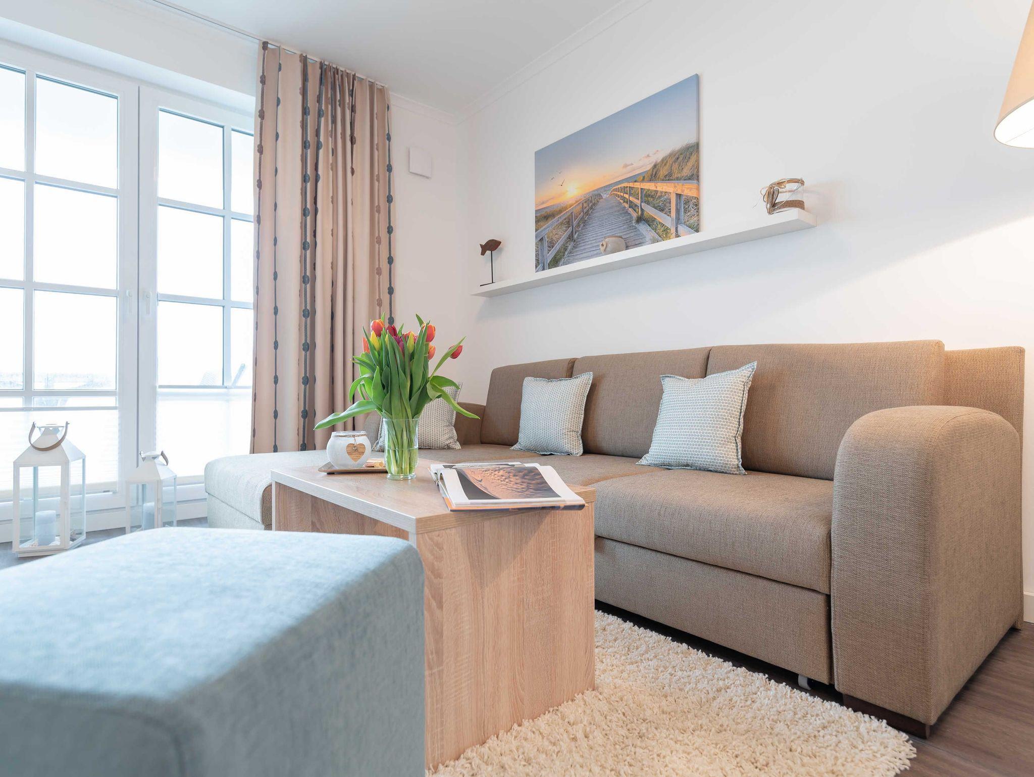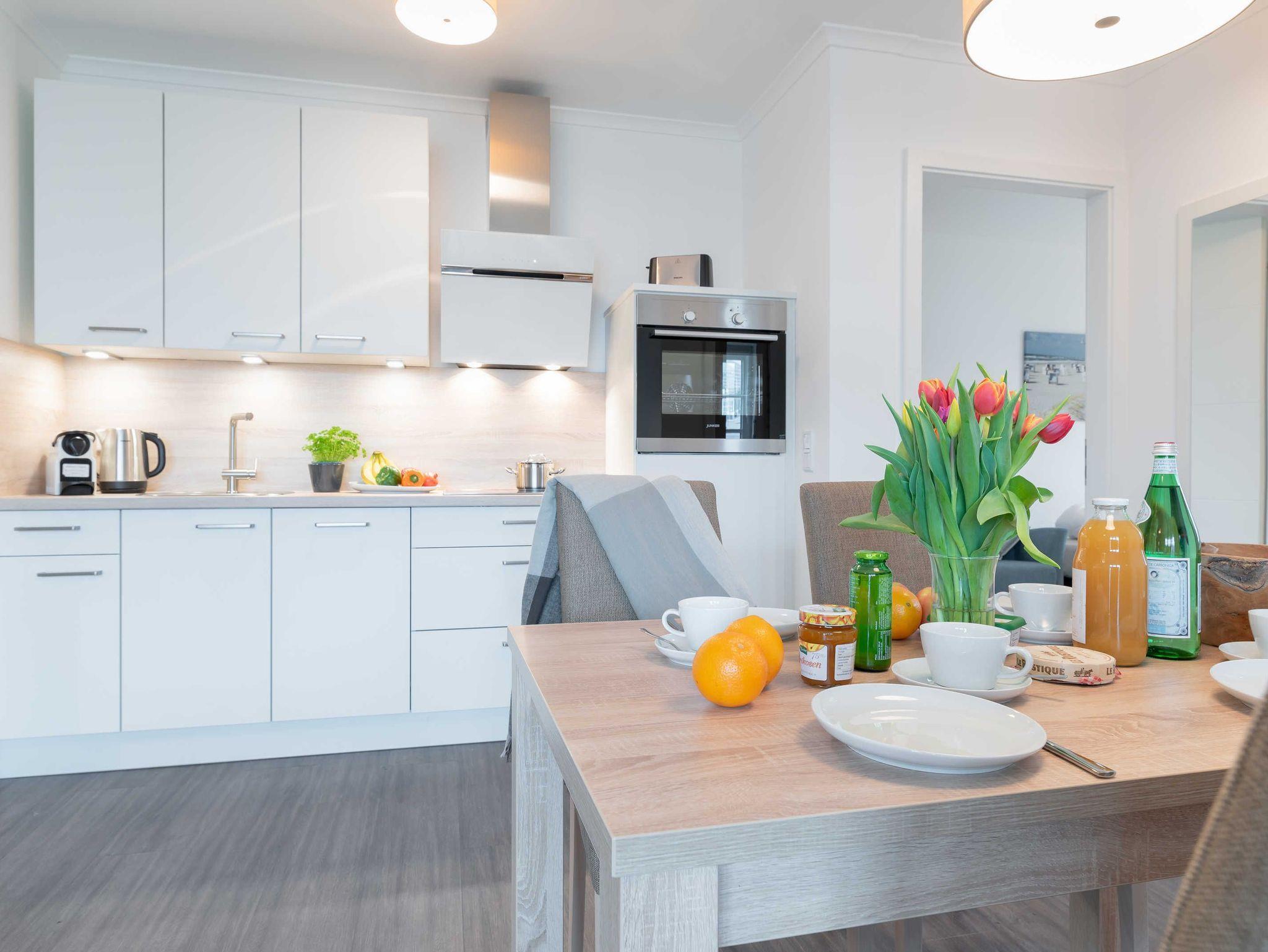 Der offene Bereich von Wohnzimmer und Küche ist geschmackvoll gestaltet. Flachbild-TV, Stereo-Anlage und Blu-ray-Player sind vorhanden. Die gemütliche Sitzecke kann zur Schlafcouch umfunktioniert werden. Ein Esstisch mit vier Stühlen runden das harmonische Bild ab.