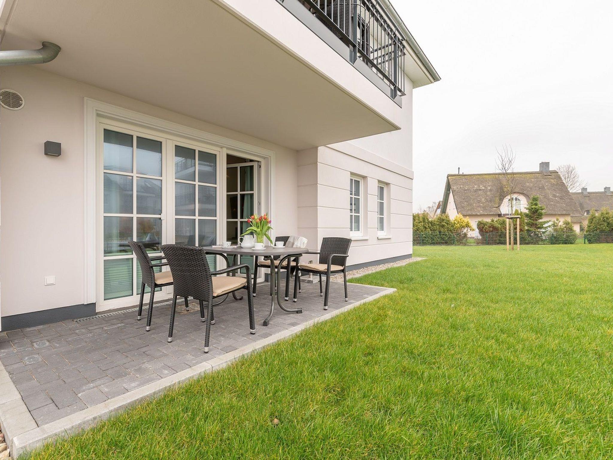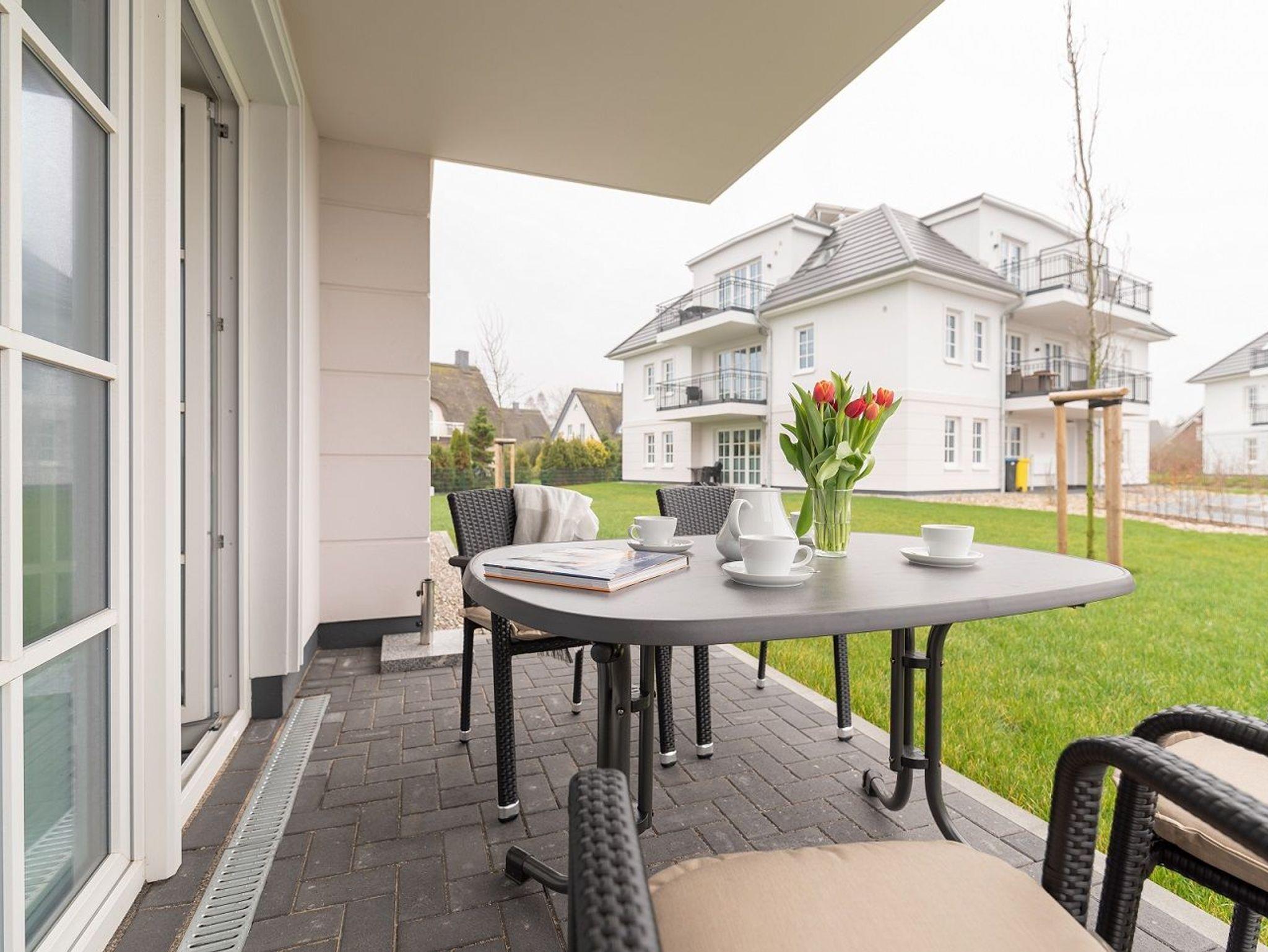 Zur Wohnung gehört eine gepflasterte Terrasse, die nach Süd-Westen ausgerichtet ist, hier laden ein Strandkorb, ein Sonnenschirm, ein Tisch mit vier Stühlen sowie ein Elektrogrill zum Verweilen ein.