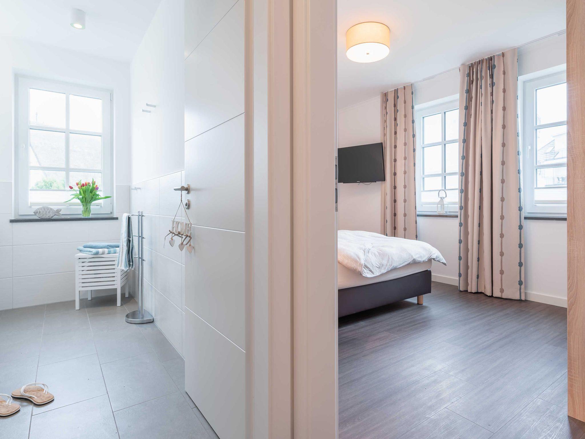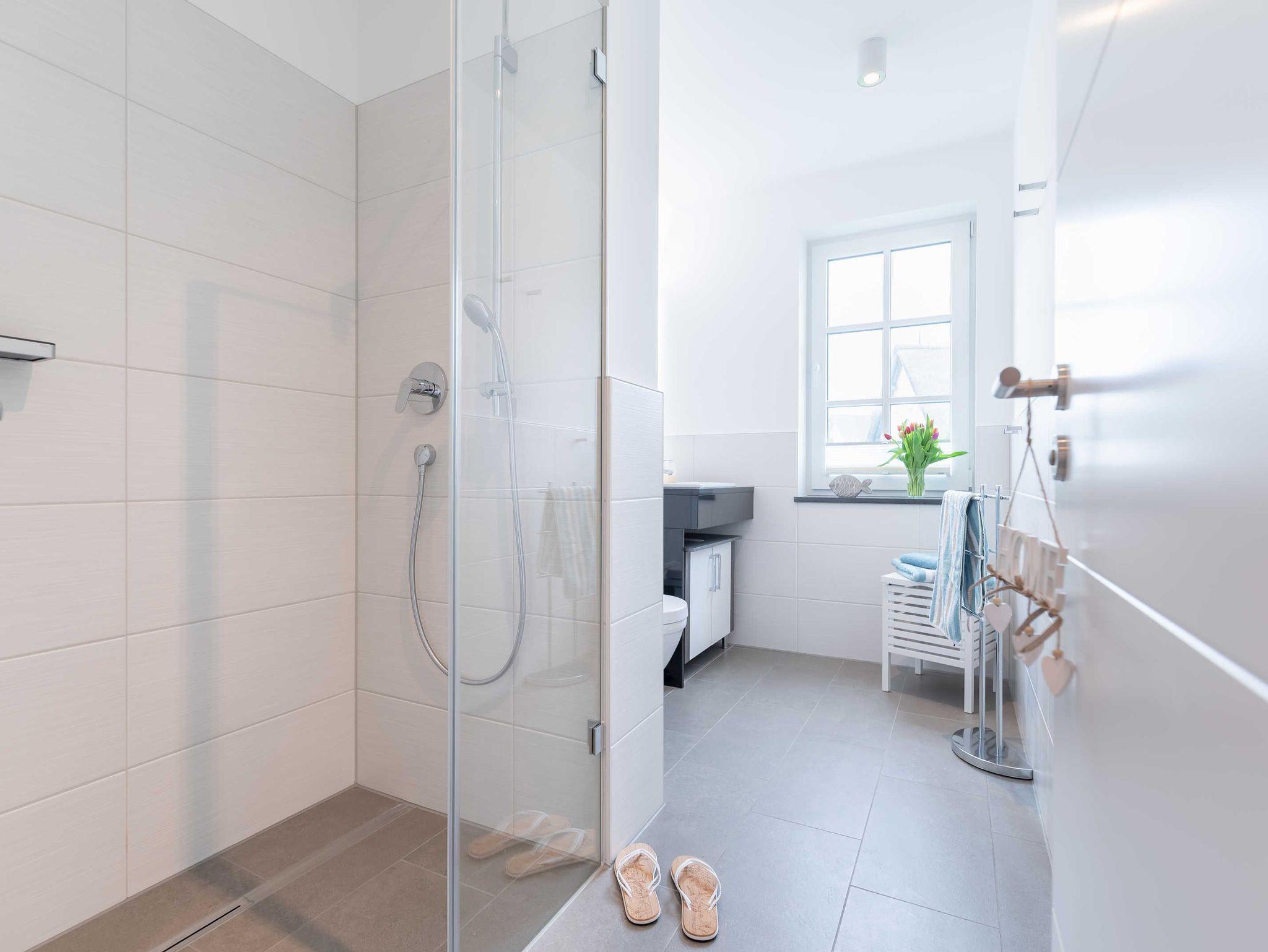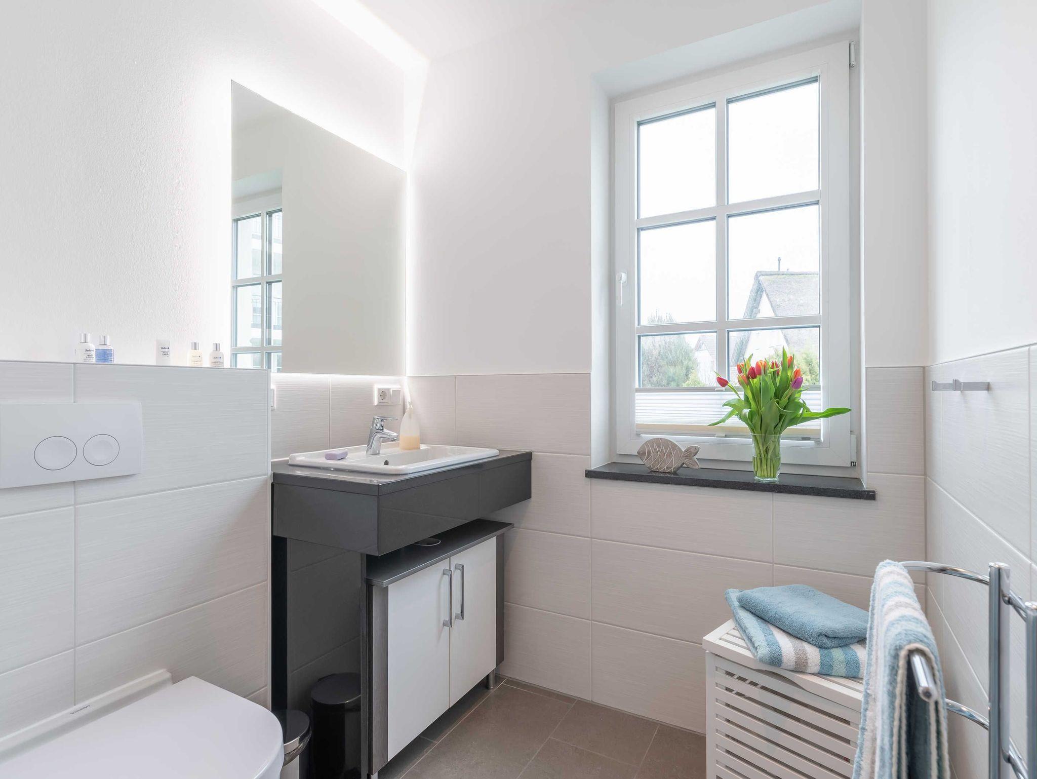 Das große Fenster erleuchtet Ihren Morgen im modern eingerichteten Bad der Ferienwohnung. Eine ebenerdige Dusche, ein Waschtisch mit Unterschrank und großem Spiegel, ein Fön und ein Kosmetikspiegel gehören zur Ausstattung.