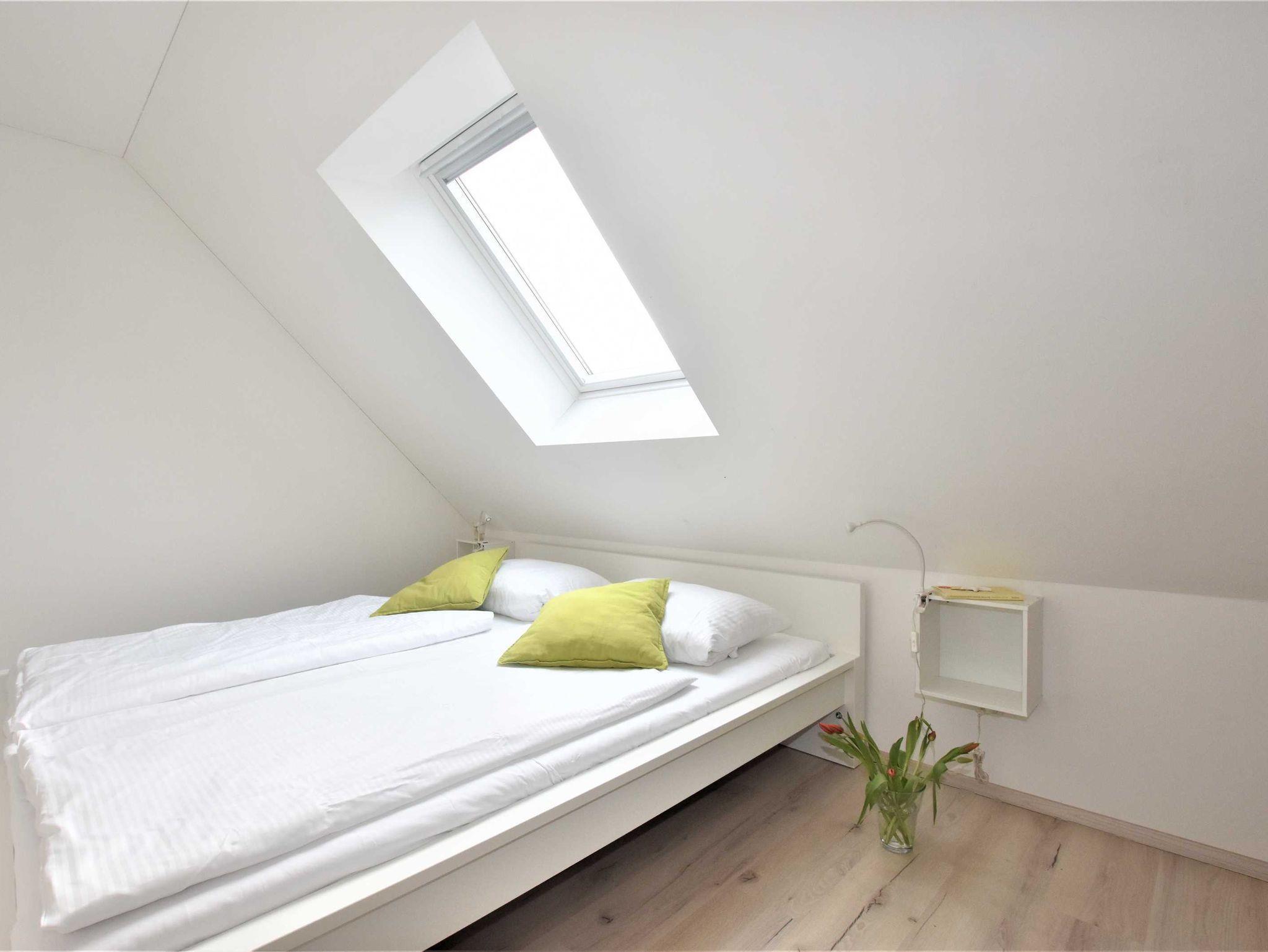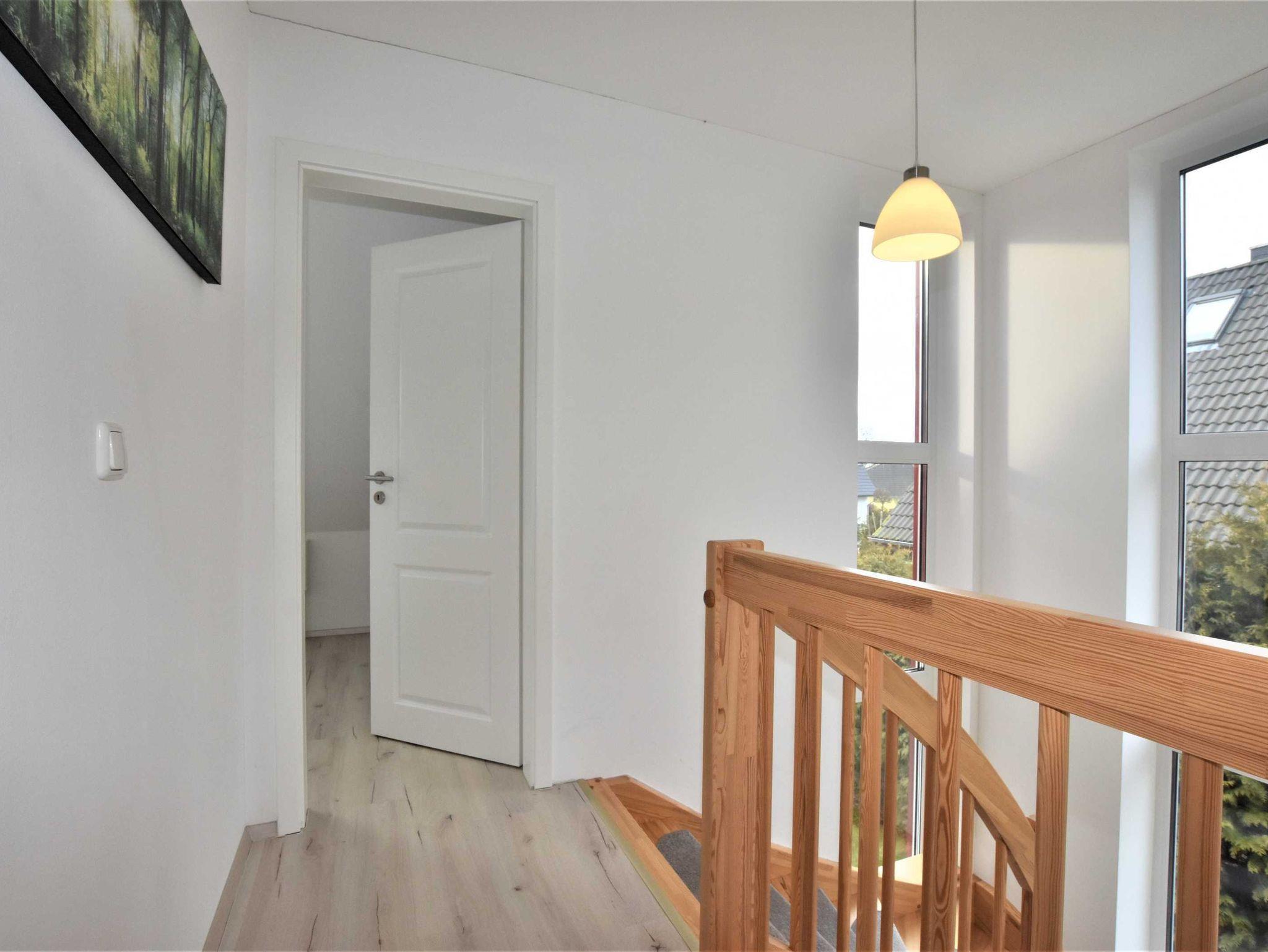 Im oberen Bereich des Ferienhauses: In das Obergeschoss gelangt man je über einen hellen und freundlichen Treppenbereich. Hier befinden sich insgesamt vier separate Schlafzimmer. Diese sind je mit einem Doppelbett (1,80 x 2 m) und ausreichend Stauraum im Kleiderschrank ausgestattet. Zwei Schlafzimmer verfügen außerdem über ein zusätzliches TV- Gerät.