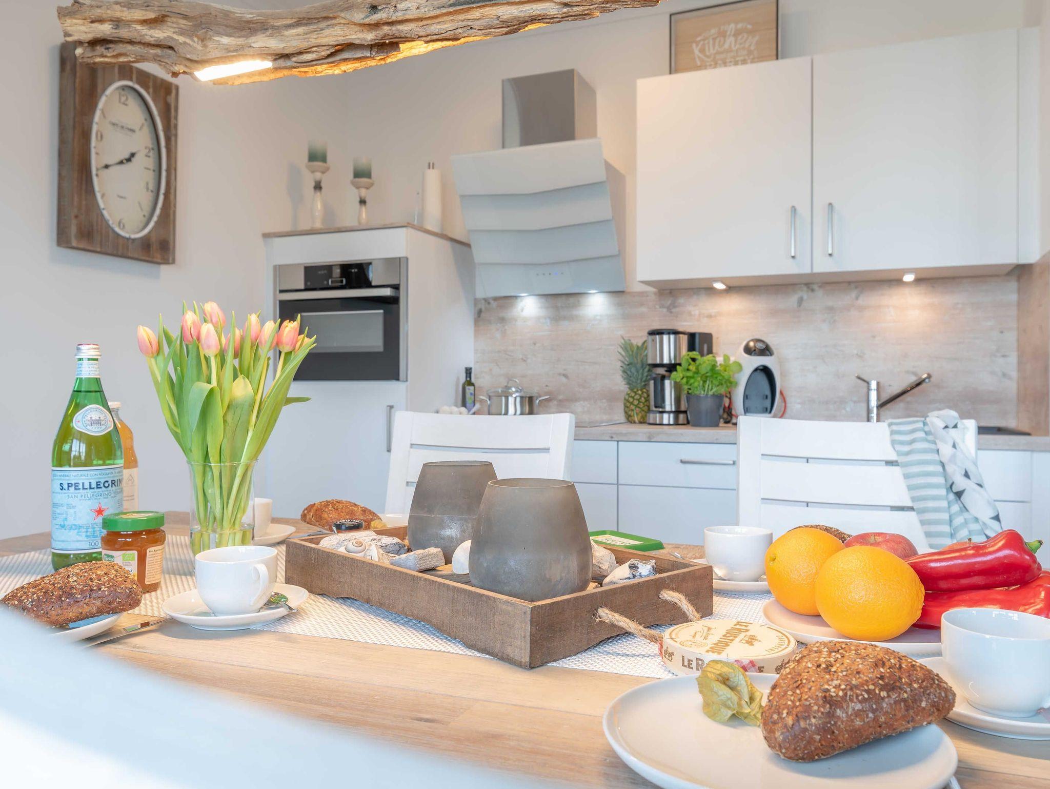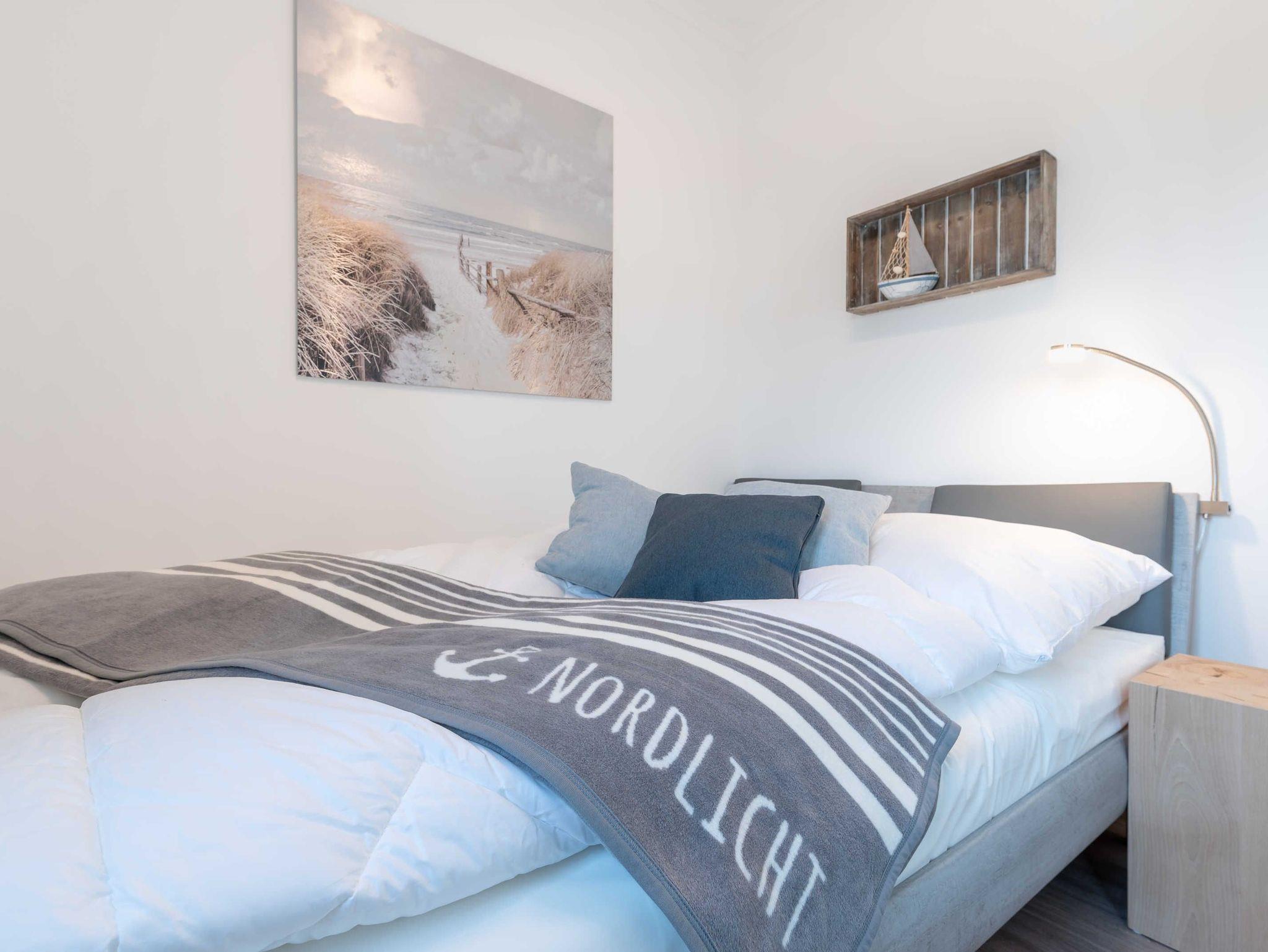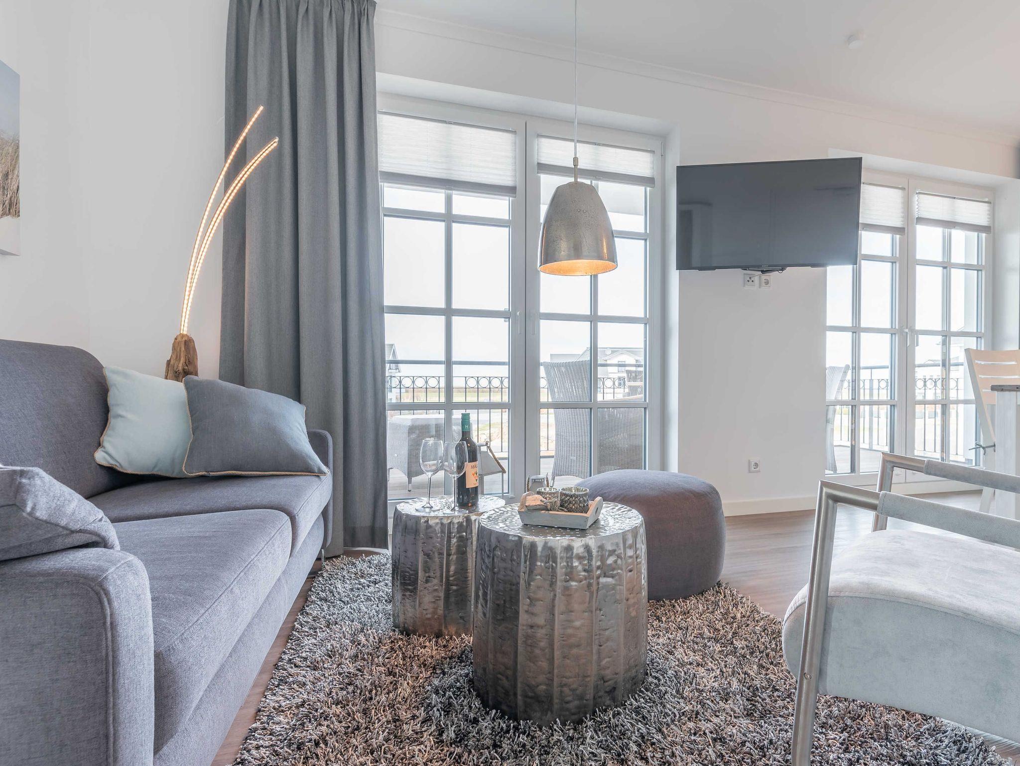 Die modern und liebevoll ausgestattete Unterkunft bietet ausreichend Platz für Familien oder Freundesgruppen mit bis zu vier Erwachsenen. Im Wohnzimmer sind eine Couch mit passendem Sessel und ein Esstisch mit vier Stühlen vorhanden. Zur Unterhaltung stehen ein 49 Zoll Flat-Screen-TV, ein Blu-Ray-Player und eine Mini-Stereoanlage zur Verfügung. In der voll ausgestatteten Küchenzeile finden Sie alles, was Sie für einen entspannten Aufenthalt benötigen: 4-Platten Cerankochfeld, Backofen mit integrierter Mikrowelle, Kühlschrank mit Tiefkühlfach, Geschirrspüler, Kaffeemaschine, Wasserkessel, Tassimo-Kapselmaschine und Toaster. Das erste Schlafzimmer ist mit einem komfortablen Boxspring Bett (180 x 200 cm) und einem Schwebetürenschrank sowie einem weiteren Flat-Screen-TV ausgestattet. Im zweiten Schlafzimmer befinden sich ein Doppelbett (140 x 200 cm) und ein eigener Kleiderschrank. Beide Schlafzimmer sind mit Verdunklungsplissees ausgestattet. Das Bad ist besticht mit einer bodengleichen Dusche mit Regenbrause, einem Handtuchheizkörper und einem Waschtisch mit großem Spiegel, Ablage und Fön. Vom Wohnraum aus haben Sie Zugang zum großzügigen Balkon mit Tisch und vier Stühlen. Von hier aus können Sie den Meerblick genießen und bei einem Glas Wein die herrliche Abendsonne beobachten. An kühlen Herbst- und Wintertagen sorgt eine Fußbodenheizung für Wärme und Gemütlichkeit.