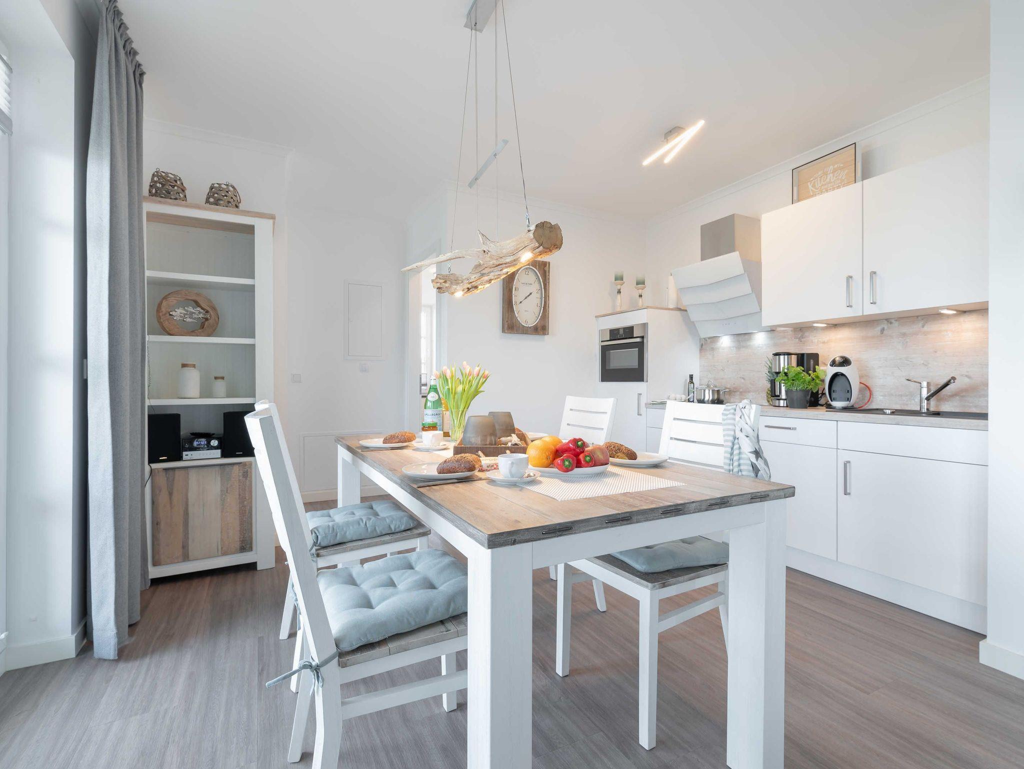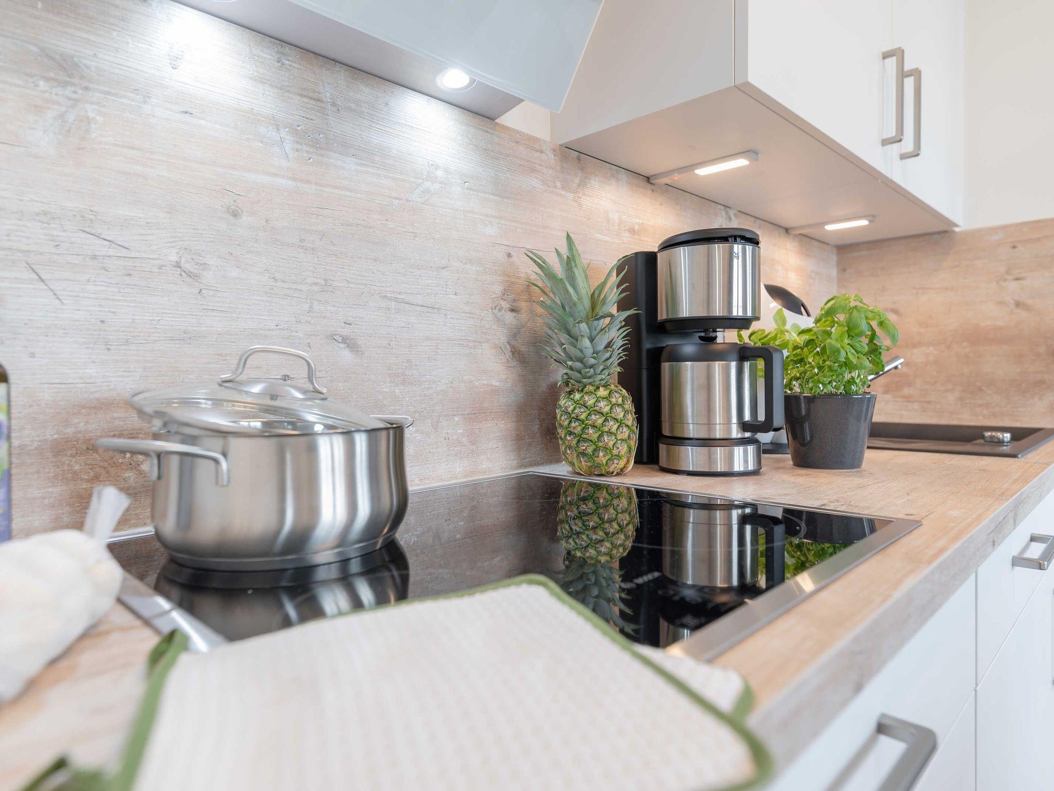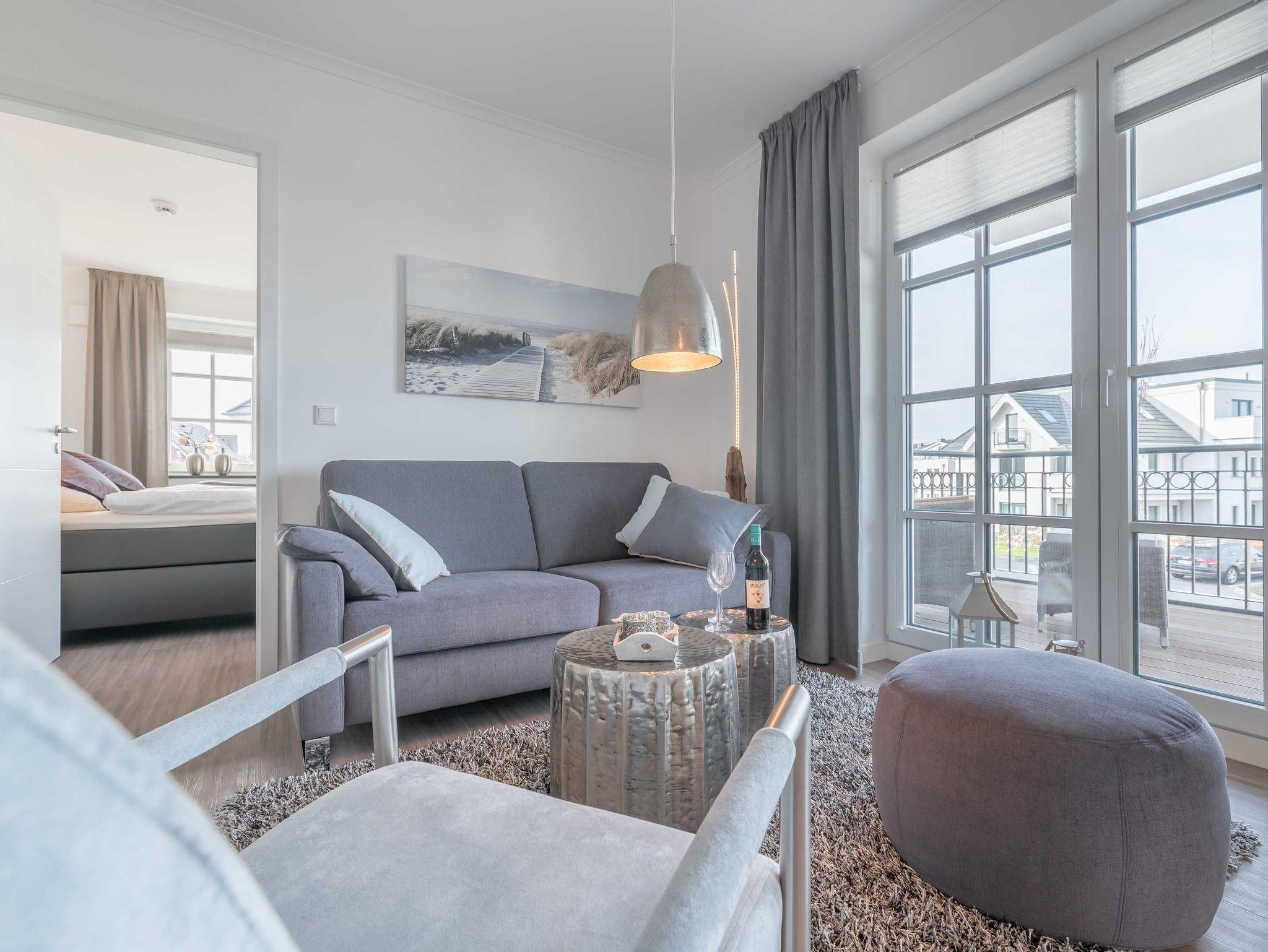 Die modern und liebevoll ausgestattete Unterkunft bietet ausreichend Platz für Familien oder Freundesgruppen mit bis zu vier Erwachsenen. Im Wohnzimmer sind eine Couch mit passendem Sessel und ein Esstisch mit vier Stühlen vorhanden. Zur Unterhaltung stehen ein 49 Zoll Flat-Screen-TV, ein Blu-Ray-Player und eine Mini-Stereoanlage zur Verfügung. In der voll ausgestatteten Küchenzeile finden Sie alles, was Sie für einen entspannten Aufenthalt benötigen: 4-Platten Cerankochfeld, Backofen mit integrierter Mikrowelle, Kühlschrank mit Tiefkühlfach, Geschirrspüler, Kaffeemaschine, Wasserkessel, Tassimo-Kapselmaschine und Toaster. Das erste Schlafzimmer ist mit einem komfortablen Boxspring Bett (180 x 200 cm) und einem Schwebetürenschrank sowie einem weiteren Flat-Screen-TV ausgestattet. Im zweiten Schlafzimmer befinden sich ein Doppelbett (140 x 200 cm) und ein eigener Kleiderschrank. Beide Schlafzimmer sind mit Verdunklungsplissees ausgestattet. Das Bad ist besticht mit einer bodengleichen Dusche mit Regenbrause, einem Handtuchheizkörper und einem Waschtisch mit großem Spiegel, Ablage und Fön. Vom Wohnraum aus haben Sie Zugang zum großzügigen Balkon mit Tisch und vier Stühlen. Von hier aus können Sie den Meerblick genießen und bei einem Glas Wein die herrliche Abendsonne beobachten. An kühlen Herbst- und Wintertagen sorgt eine Fußbodenheizung für Wärme und Gemütlichkeit.