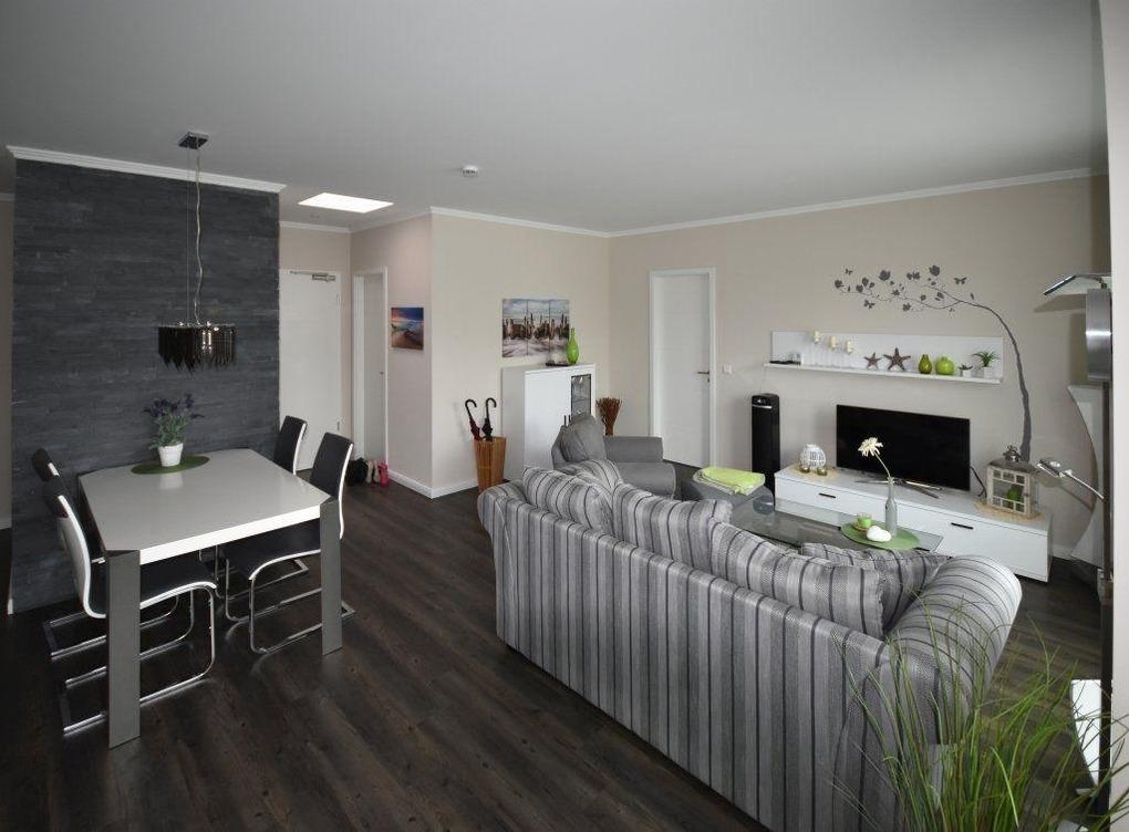 Das großzügige Wohnzimmer mit Essplatz, Sofa und Sessel ist besonders bequem eingerichtet. Hier befindet sich auch der Medienbereich.
