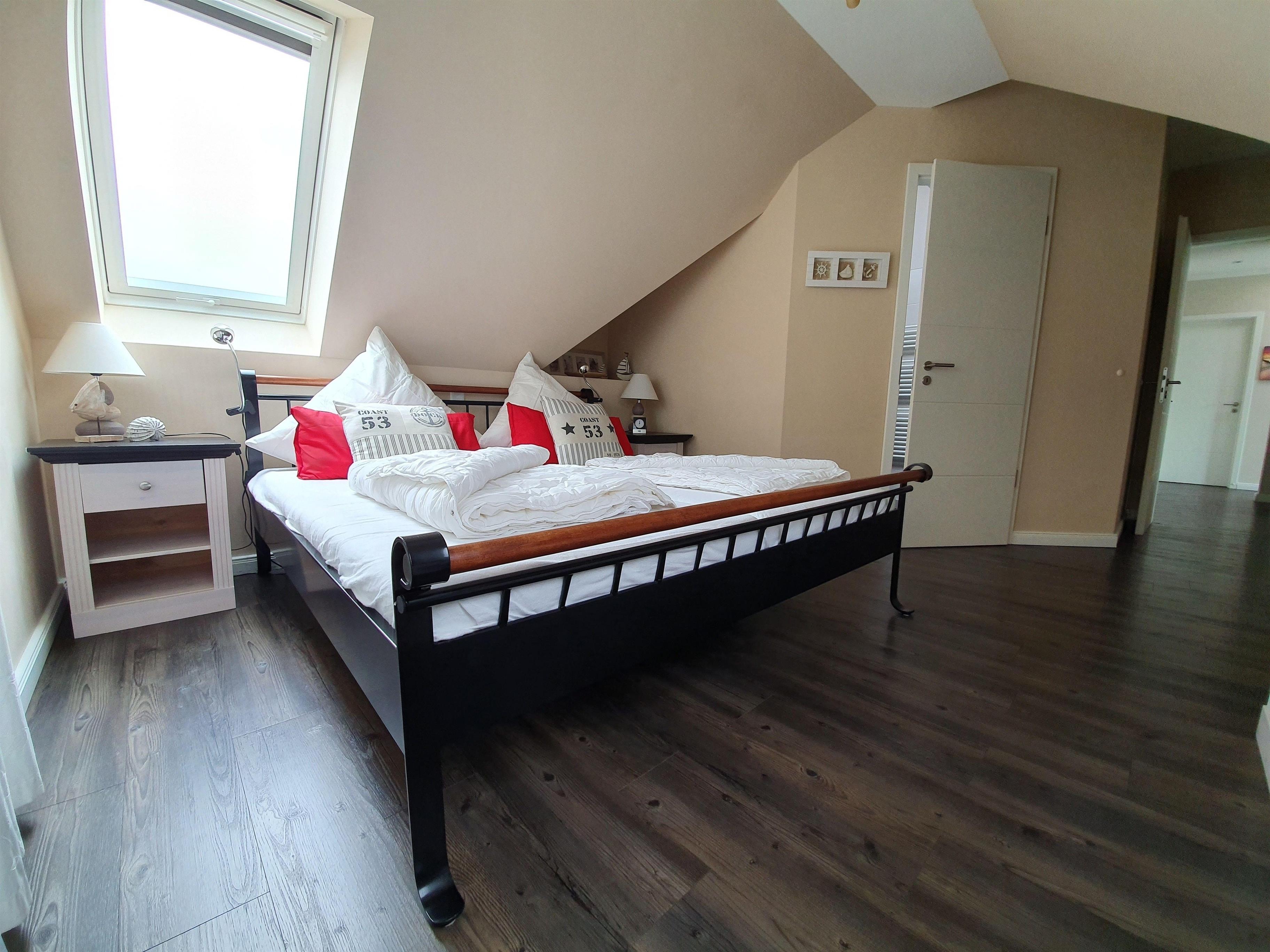 Das große Schlafzimmer ist mit einem Doppelbett (1,80 x 2,00 m) und sehr ansprechenden Möbeln sowie einem weiteren Flachbild-TV ausgestattet. Vom Schlafzimmer aus haben Sie direkten Zugang zu einem kleinen Rundbalkon mit Aussicht auf die Ostsee.