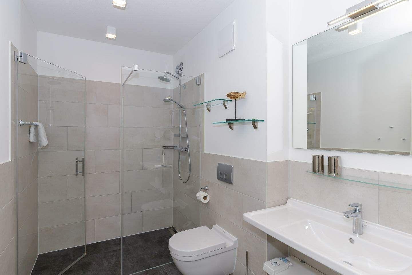 Im geräumigen Bad befinden sich eine großzügige, ebenerdige Regendusche, ein Handtuchtrockner, ein Waschtisch mit Föhn und Kosmetikspiegel.