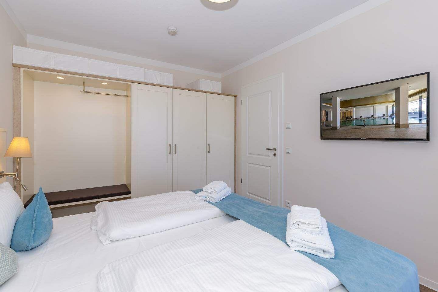 Das separate Schlafzimmer ist mit einem modernen Boxspringbett (180cm x 210cm), einem Flat Screen-TV und einem Safe ausgestattet. Der geräumige Kleiderschrank bietet genügend Platz für die mitgebrachte Urlaubsgarderobe.