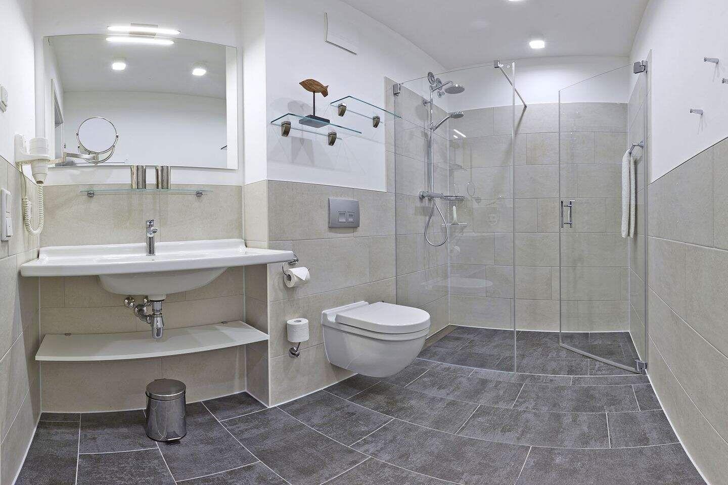 Die offene Regendusche ist das Highlight der Wohnung. Das Badezimmer ist ausgestattet mit einem Handtuchwärmer, einem Waschtisch mit Kosmetikspiegel und einem Haartrockner.