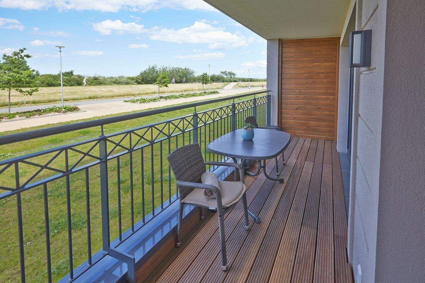 Der überdachte Balkon ist sowohl vom Wohnzimmer als auch vom Schlafzimmer aus begehbar. Natürlich stehen Ihnen hier auch Terrassenmöbel zur Verfügung, sodass Sie beispielweise Ihr Frühstück oder Ihr Abendessen ganz privat im Sonnenschein der Abendsonne zu sich nehmen können. Die Waterkant Suites liegen direkt an der Promenade in Börgerende und somit direkt am Meer.