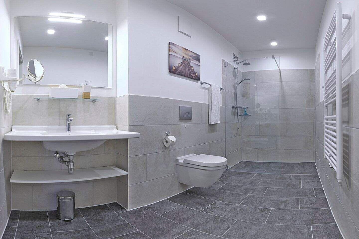 Im geräumigen Bad befinden sich eine großzügige, ebenerdige Regendusche, ein Handtuchtrockner, ein Waschtisch mit Föhn und Kosmetikspiegel.