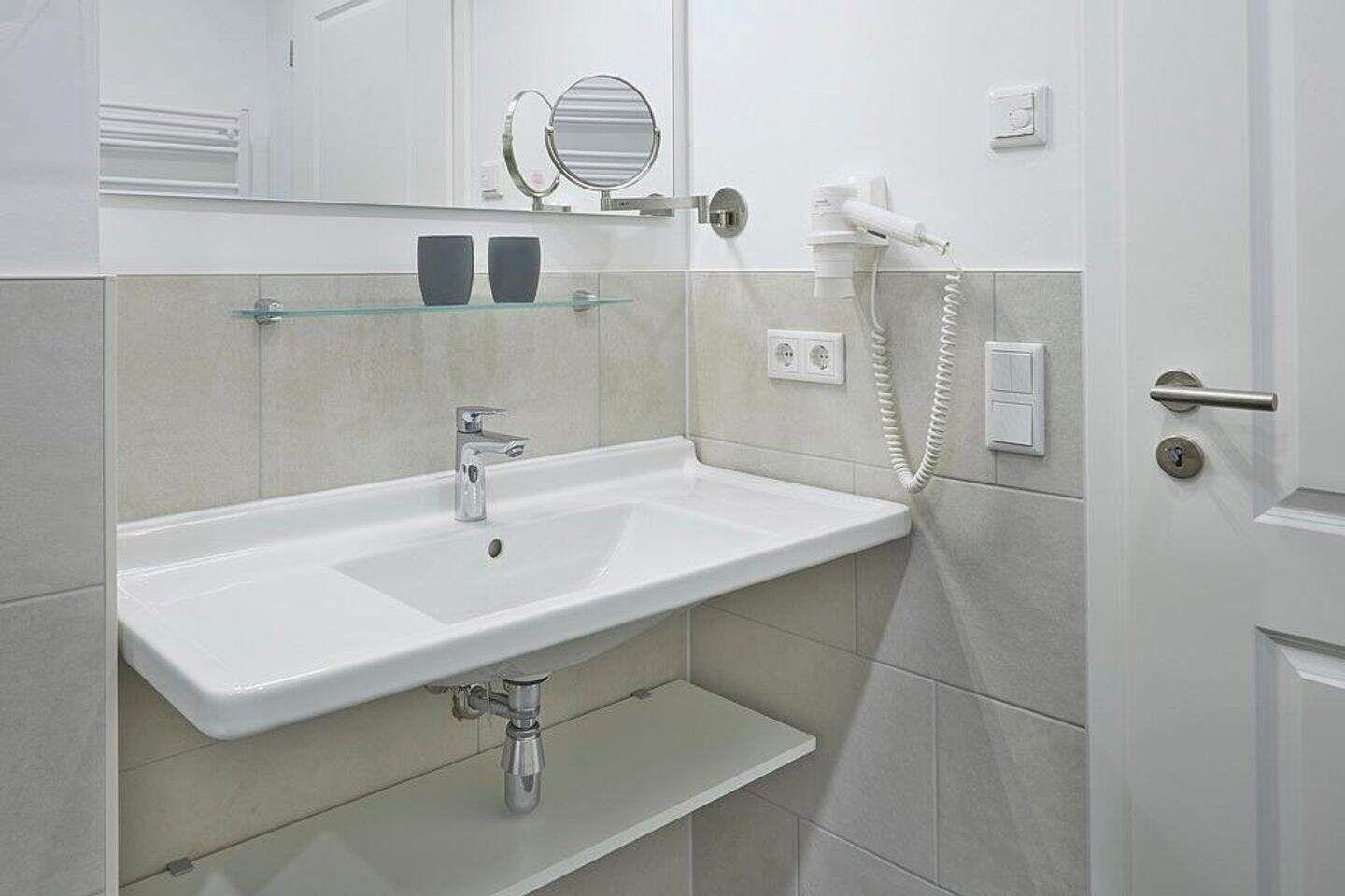 Die offene Regendusche ist das Highlight des Badezimmers und ausgestattet mit einem Handtuchwärmer, einem Waschtisch mit Kosmetikspiegel und einem Haartrockner.