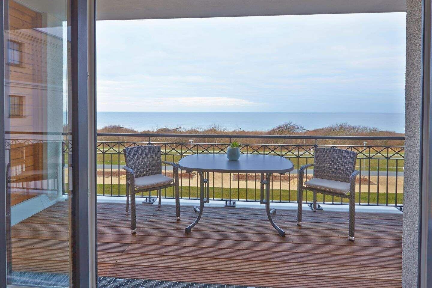 Der überdachte Balkon ist sowohl vom Wohnzimmer als auch vom Schlafzimmer aus begehbar. Natürlich stehen Ihnen hier auch Terrassenmöbel zur Verfügung, sodass Sie beispielweise Ihr Frühstück oder Ihr Abendessen ganz privat im Sonnenschein zu sich nehmen können. Die Waterkant Suites liegen an der Promenade in Börgerende und somit direkt am Meer.