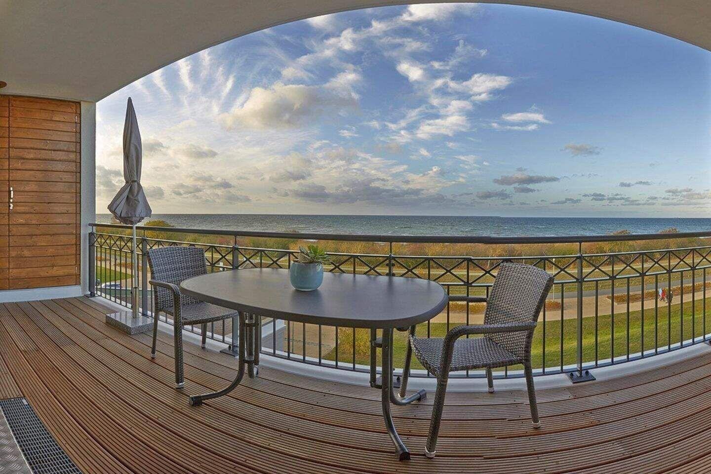 Auf dem überdachten Balkon, der zur Meerseite gelegen ist, stehen Ihnen Terrassenmöbel zur Verfügung. Hier können Sie mit Blick auf die Ostsee entspannen.
