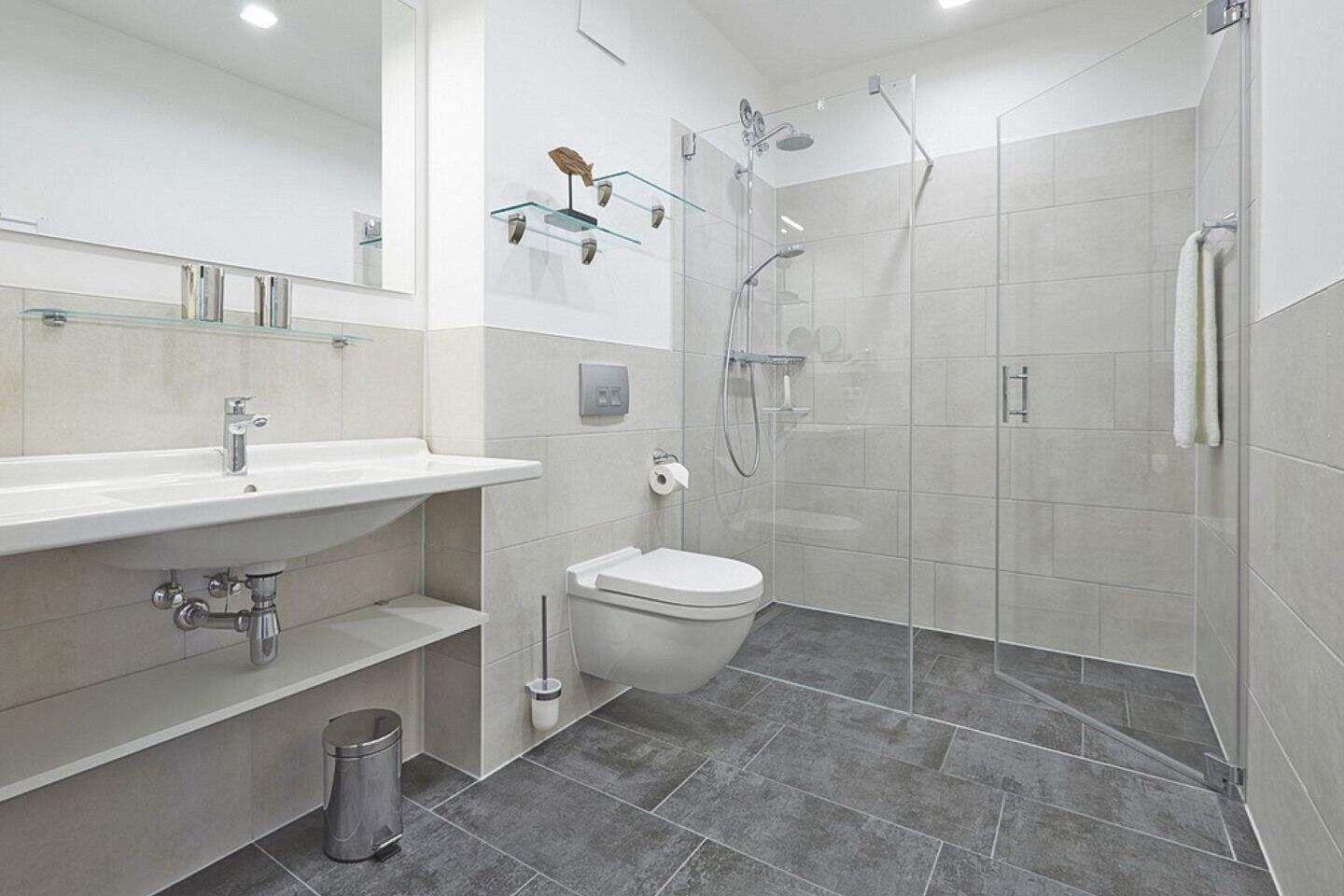 Im geräumigen Bad befinden sich eine großzügige, ebenerdige Regendusche, ein Handtuchtrockner, ein Waschtisch mit Föhn und Kosmetikspiegel.