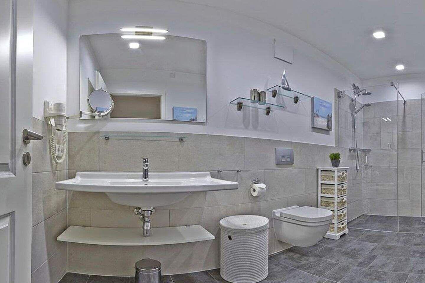 Die offene Regendusche ist das Highlight des Badezimmers. Es ist ausgestattet mit einem Handtuchwärmer, einem Waschtisch mit Kosmetikspiegel und einem Haartrockner.