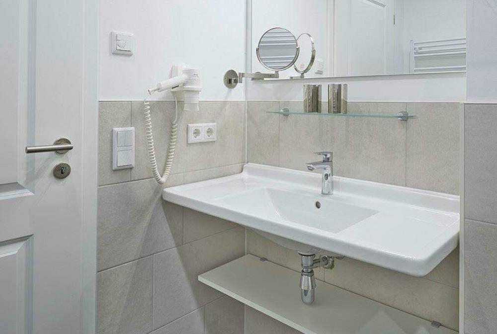 Im geräumigen Bad befinden sich eine großzügige, ebenerdige Regendusche, ein Handtuchtrockner, ein Waschtisch mit Föhn und Kosmetikspiegel.
