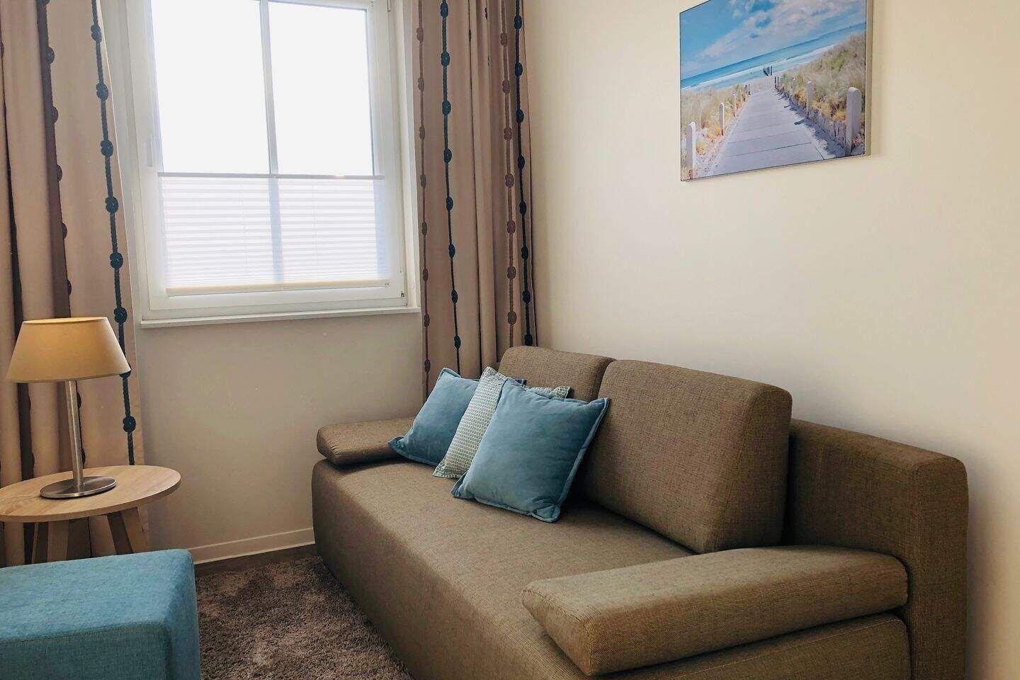 Diese Suite ist einige der wenigen, welche über ein zusätzliches Zimmer verfügt. Dieses ist mit einer bequemen Doppelschlafcouch ausgestattet (1,40m x 2,00 m) und bietet einen kleinen Blick auf die Ostsee.