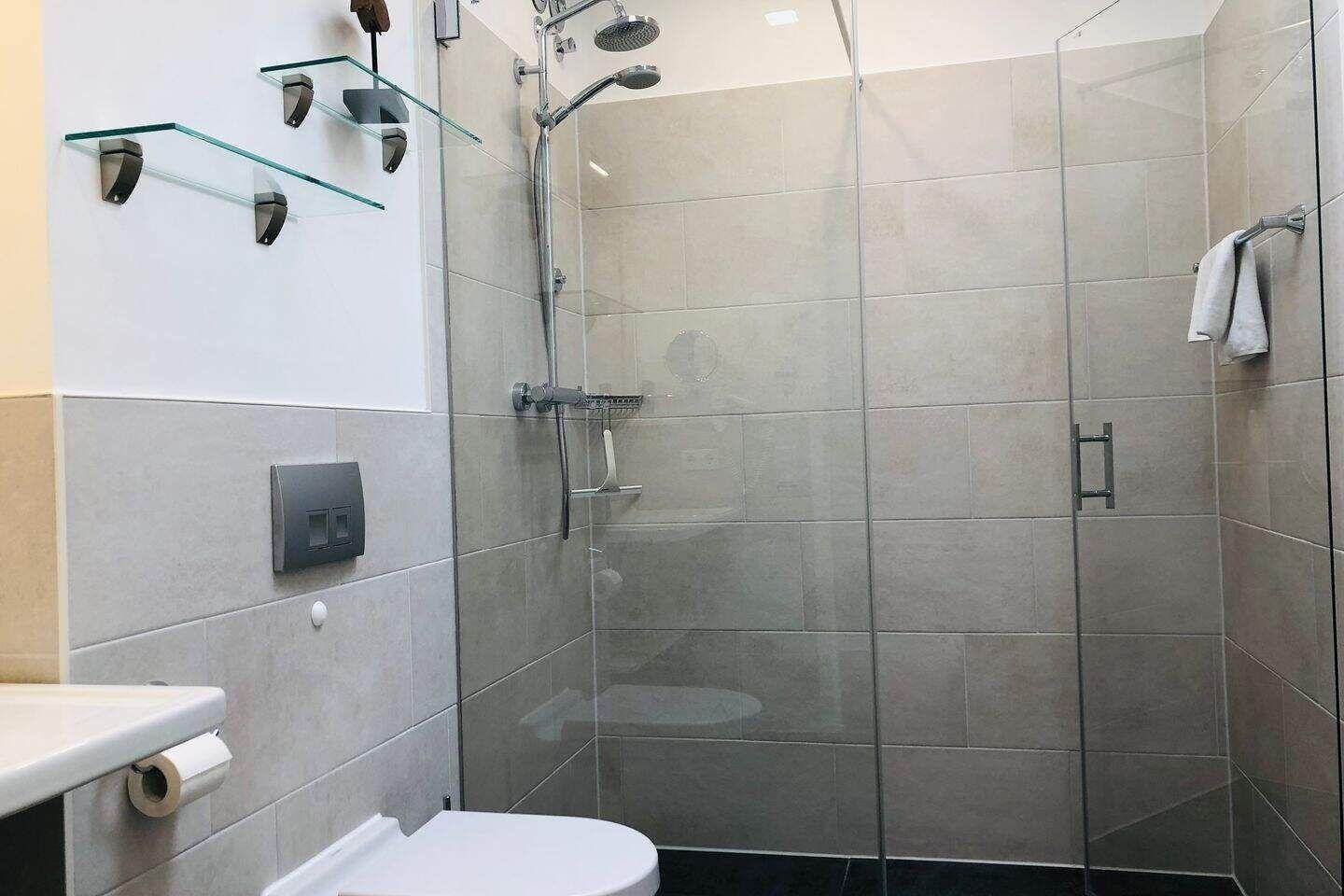 Die offene Regendusche ist das Highlight der Wohnung. Das Badezimmer ist ausgestattet mit einem Handtuchwärmer, einem Waschtisch mit Kosmetikspiegel und einem Haartrockner.