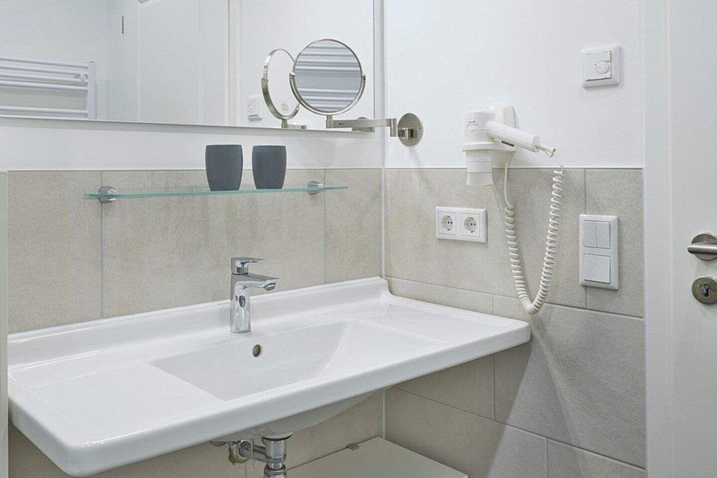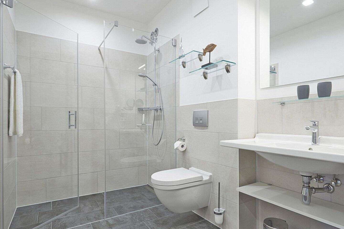 Im geräumigen Bad befinden sich eine großzügige, ebenerdige Regendusche, ein Handtuchtrockner, ein Waschtisch mit Föhn und Kosmetikspiegel.