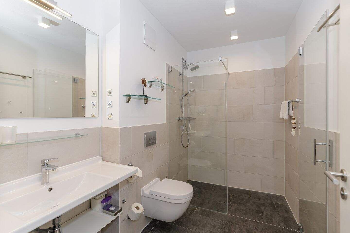 Die offene Regendusche ist das Highlight des Badezimmers. Es ist weiterhin ausgestattet mit einem Handtuchwärmer, einem Waschtisch mit Kosmetikspiegel und einem Haartrockner.