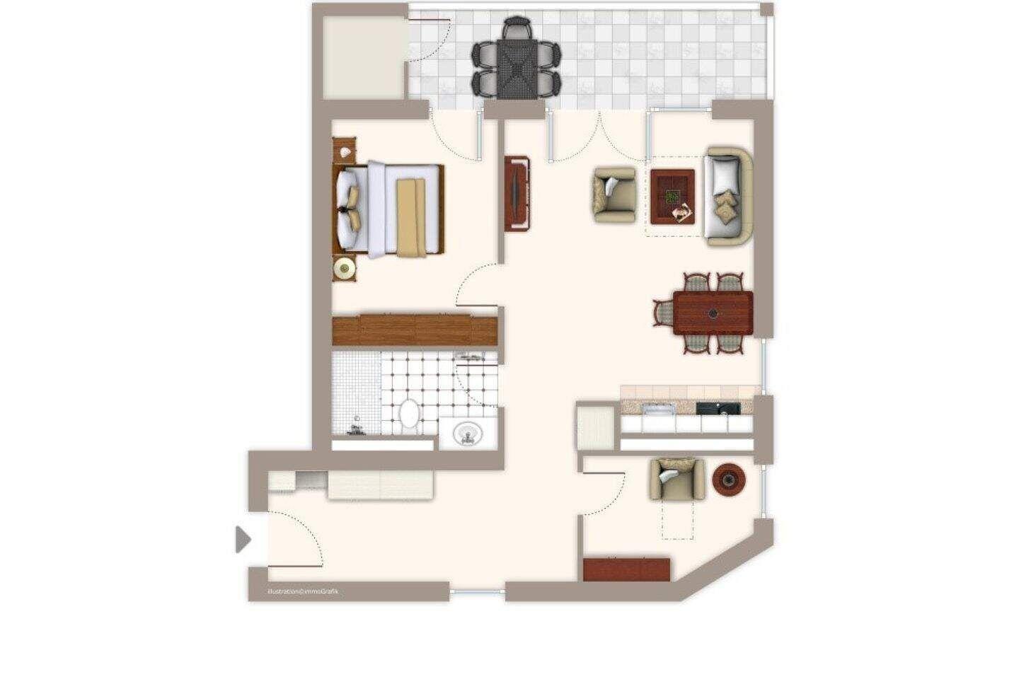 Der überdachte Balkon ist sowohl vom Wohnzimmer als auch vom Schlafzimmer aus begehbar. Natürlich stehen Ihnen hier auch Terrassenmöbel zur Verfügung, sodass Sie beispielsweise Ihr Frühstück oder Ihr Abendessen ganz privat im Sonnenschein zu sich nehmen können. Die Waterkant Suites liegen an der Promenade in Börgerende und somit direkt am Meer.