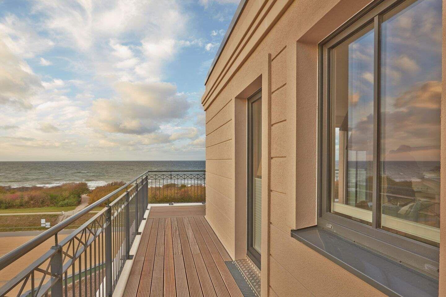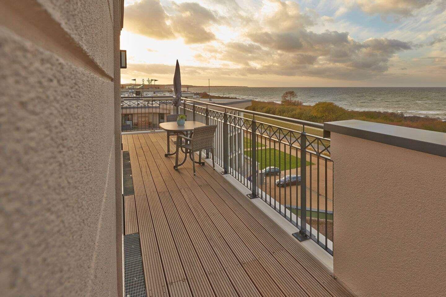 Die Dachterrasse ist sowohl vom Wohnzimmer als auch vom Schlafzimmer aus begehbar. Natürlich stehen Ihnen hier auch Terrassenmöbel zur Verfügung sodass Sie beispielsweise Ihr Frühstück oder Ihr Abendessen ganz privat im Sonnenschein und mit Blick auf die Ostsee zu sich nehmen können. Die Waterkant Suites liegen an der Promenade in Börgerende und somit direkt am Meer.