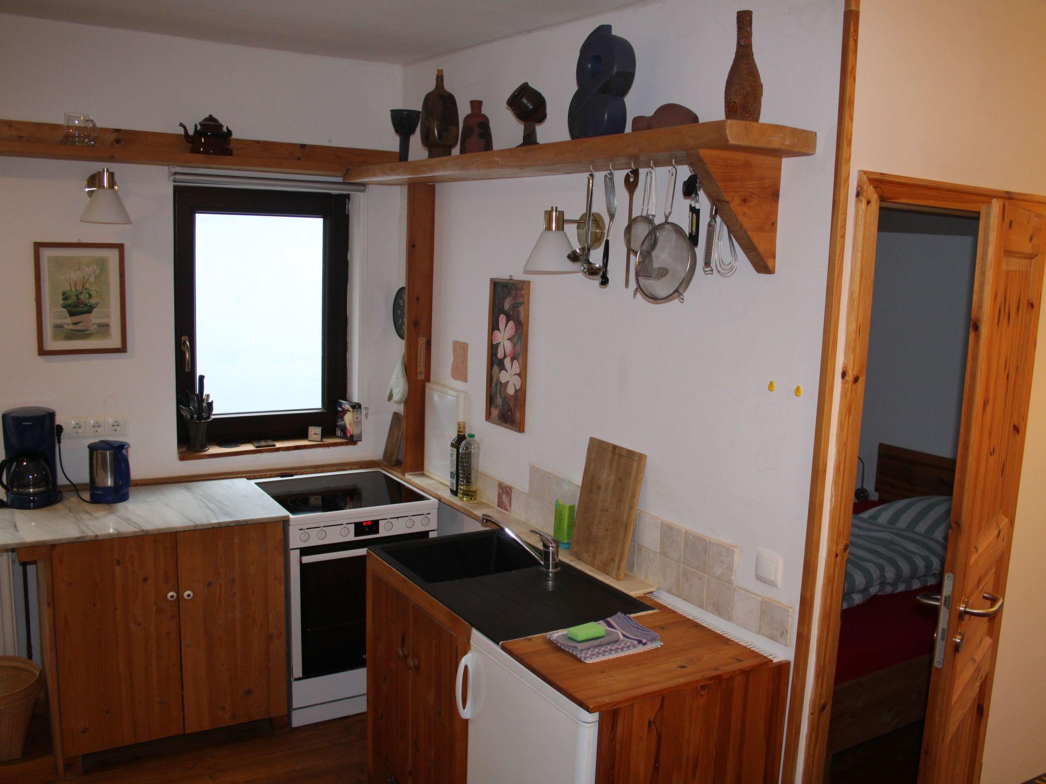 This very small, 28 square metre two-room flat (renovated in 2022) for non-smokers is located on the ground floor and can accommodate max. 2 people. The flat has:- 1 very small bathroom with WC, shower and washbasin,- 1 small kitchen-living room (kettle, cooker, fridge, sink and coffee machine) with 2 armchairs and a dining area, smart TV, WLAN - 1 small bedroom with double bed (1.40 m wide). So that the flat is not overloaded, some equipment, such as hoover - fan - etc. are stored separately. Ask us, so it will be provided immediately.