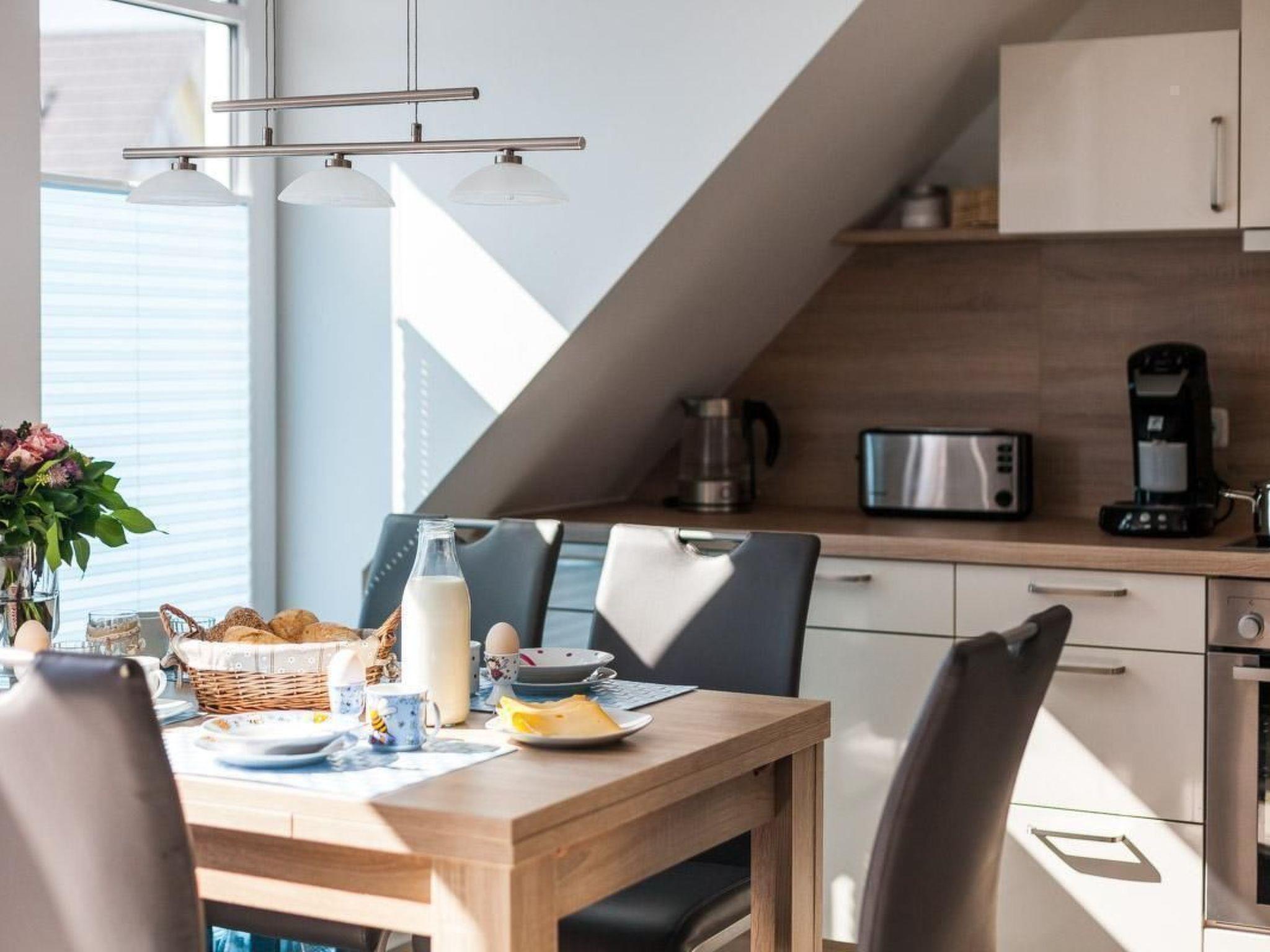 The maisonette with under-floor heating can accommodate up to four people. It has a separate bedroom with a double bed (180 x 200cm). The modern, open living and dining room is also on the first floor. The living room provides a sofa bed with a sprung mattress and a flatscreen TV. This floor also has a bathroom with a walk-in shower and a towel radiator. Stairs in the hallway lead up to the generous, open sleeping gallery on the second floor suitable for children. It also has a pull-out sofa. Children have also been taken into consideration and a travel cot, highchair and bottle warmer are available free of charge. The second floor can be secured by a gate. The apartment has been classified as three-star by the DTV.