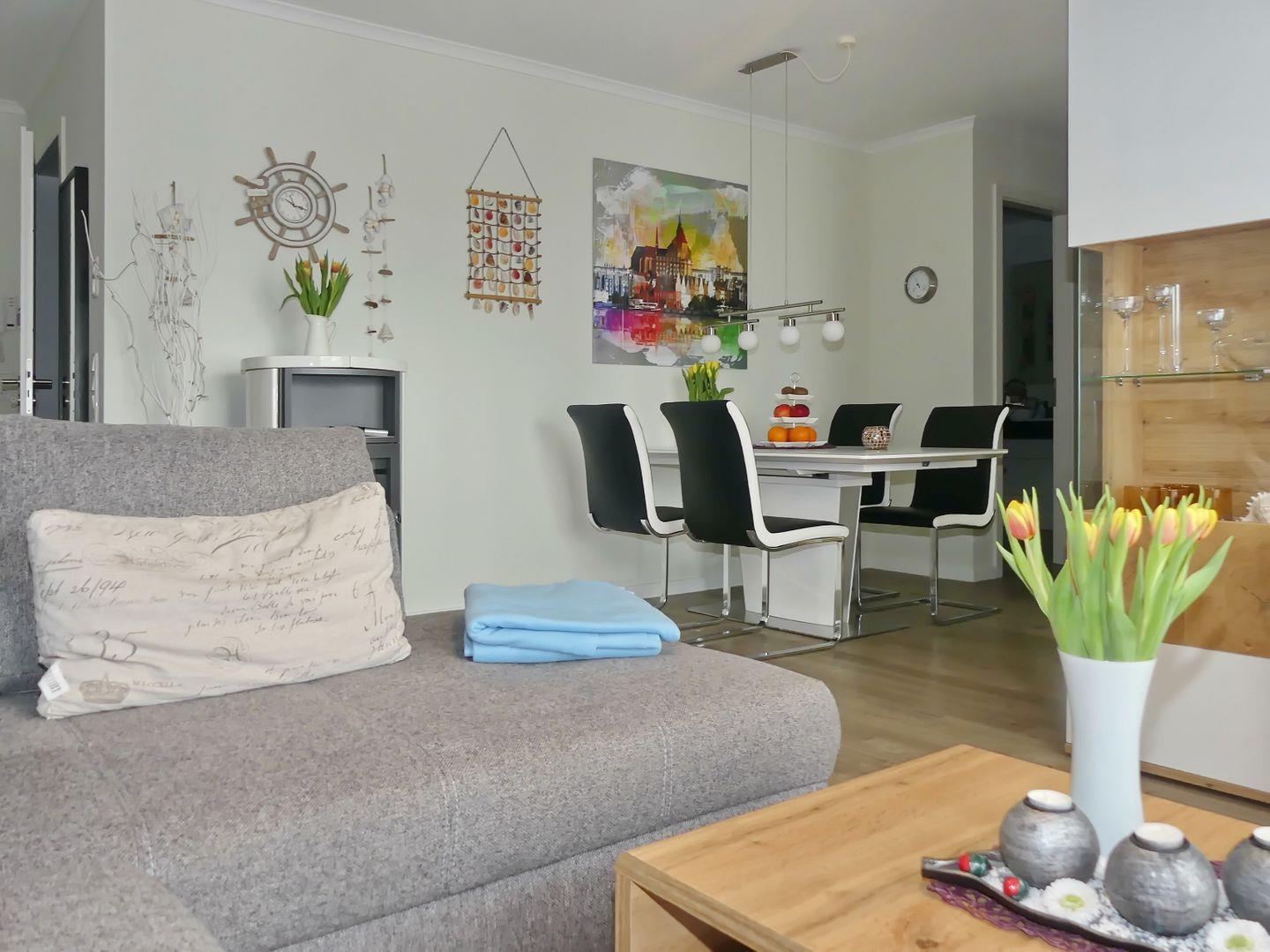 Der Wohnbereich wurde mit einer Doppelschlafcouch (120x190 cm),einem Flachbild-TV mit integriertem Radio, CD-Player und DVD-Player eingerichtet. Für gemütliche Stunden steht ein Bio-Ethanol Kamin (gegen Gebühr) zur Verfügung. Die Küchenzeile ist mit Backofen, 4-Platten-Cerankochfeld, Kühlschrank mit Gefrierfach, Geschirrspüler, Mikrowelle, Kaffeemaschine, Wasserkocher und Toaster sehr modern ausgestattet. Der großzügige Essbereich bietet Platz für 4 Personen. Die angrenzende Terrasse mit Südwest-Ausrichtung ist vom Wohn- sowie Schlafbereich zugänglich und ist windgeschützt.