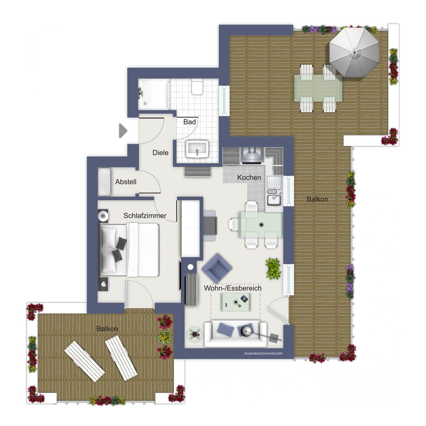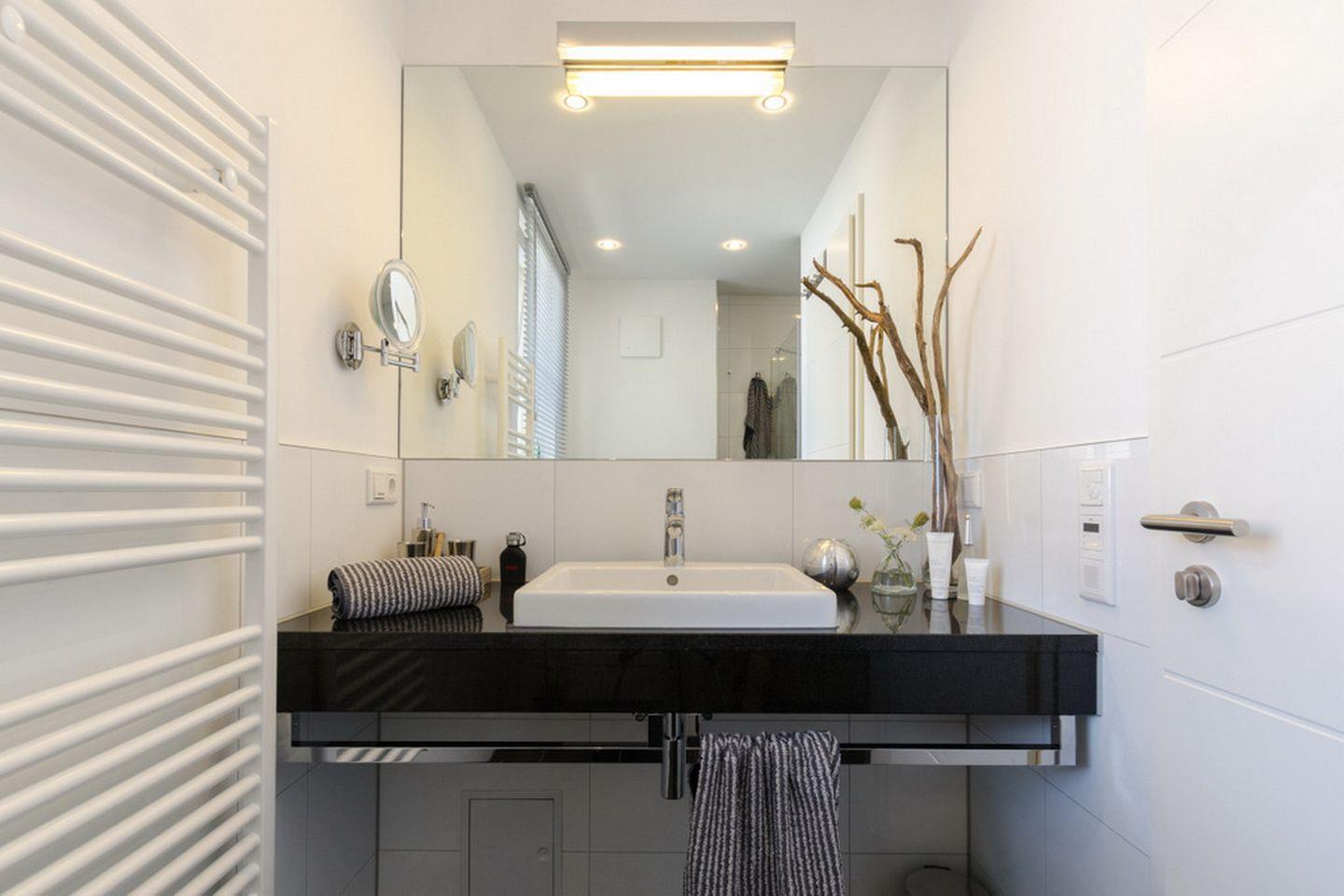 Zum gefliesten Tageslichtbad mit WC und ebenerdiger Dusche gehören auch ein moderner Waschtisch sowie Handtuchtrockner und Radio. Der Bodenbelag im Wohnbereich, Küche, Flur und Schlafzimmer ist Designbelag. Alle Räume sind mit einer Fußbodenheizung versehen. Es handelt sich um eine Nichtraucher-Wohnung. Haustiere sind nicht erlaubt.