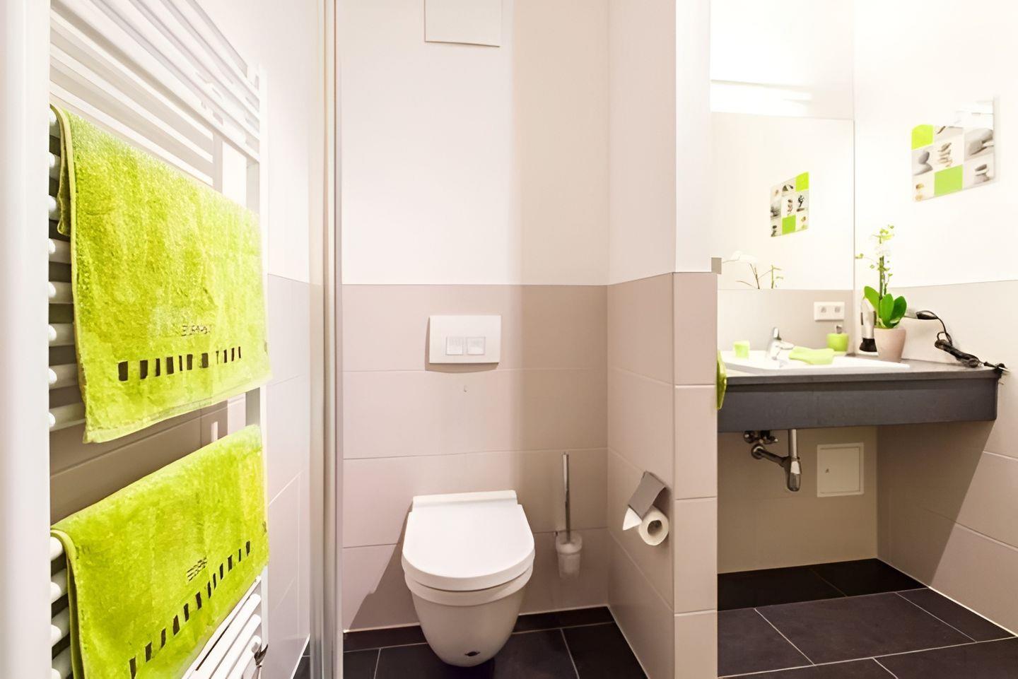 beleuchteten Kosmetikspiegel, einem Handtuchtrockner und einem Fön.