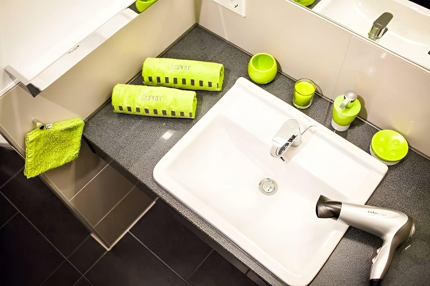 Tropenbrause, einem edlem Granit-Waschtisch, einem großen Bad-Spiegel, einem