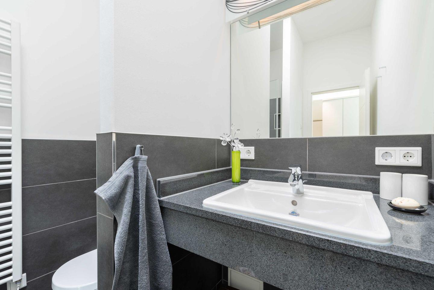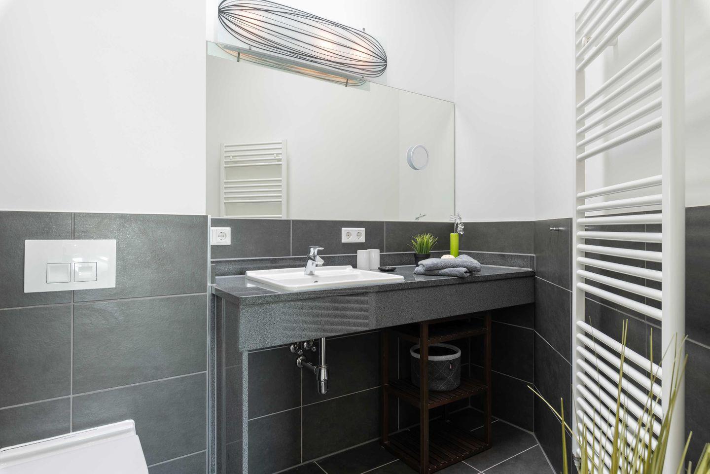 betreten. Beide Duschbäder haben eine bodengleiche Dusche und einen großen