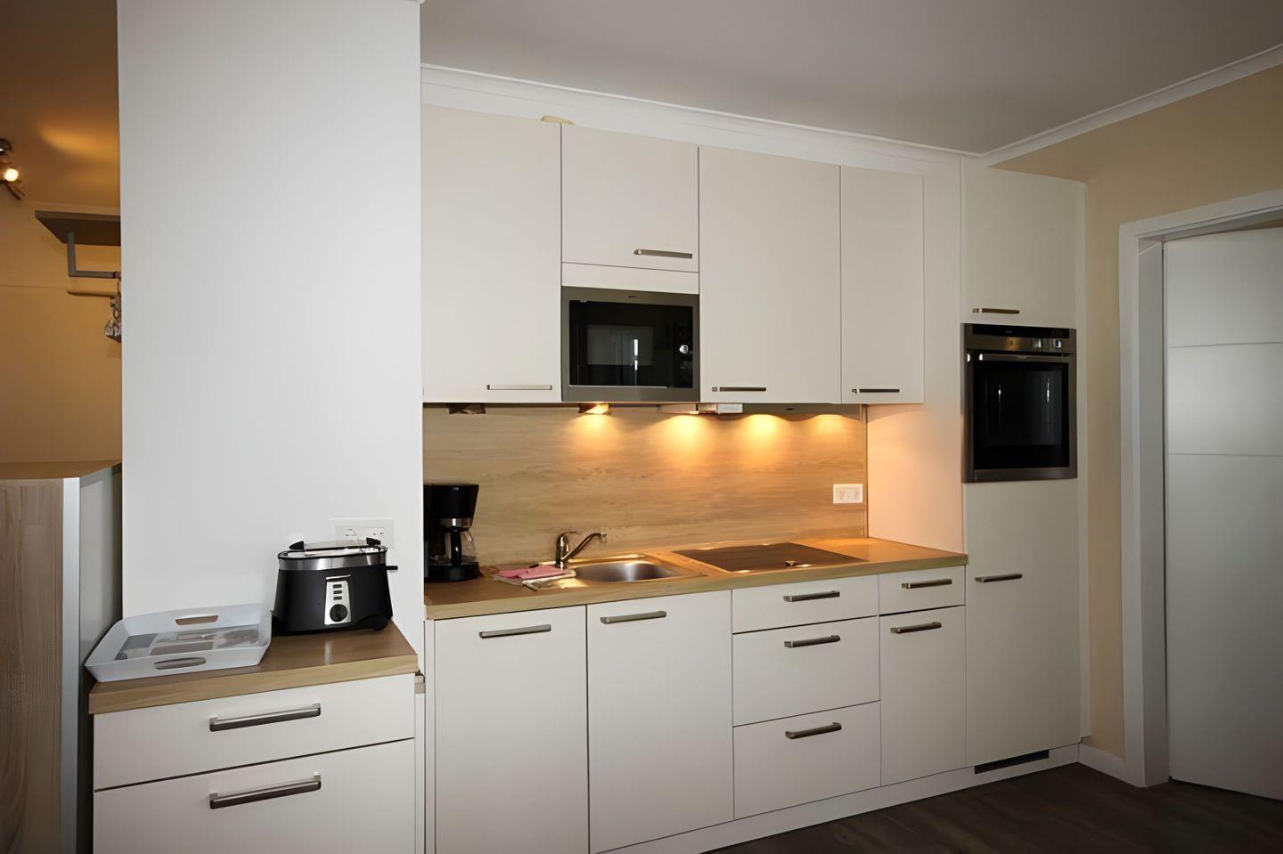 Kühlschrank, Backofen mit Cerankochfeld und Mikrowelle. Vom Wohnraum sowie vom