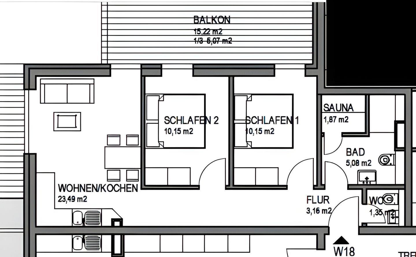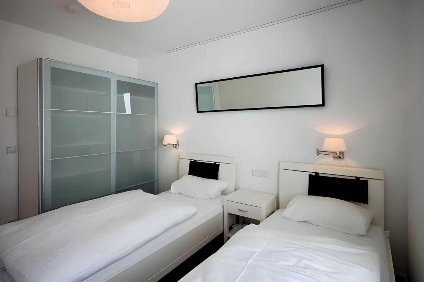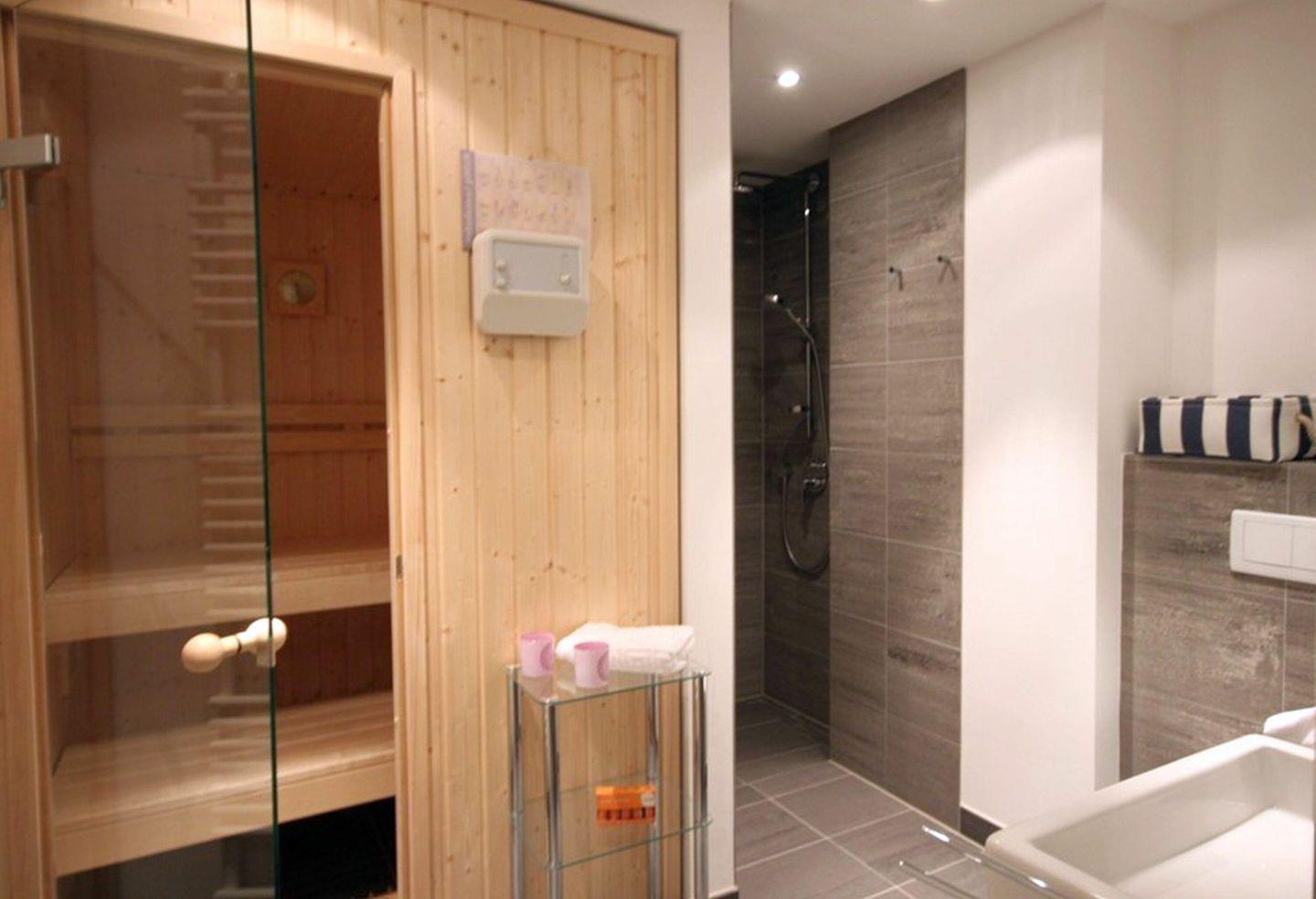 Diese Ferienwohnung besitzt ZWEI SCHLAFRÄUME. Ein Schlafraum ist mit einem Doppelbett und einem Schwebetürschrank ausgestattet. Im zweiten stehen zwei Einzelbetten und ein Kleiderschrank für Ihre Kleidung zur Verfügung. Das DUSCHBAD besticht mit einer bodengleichen Dusche, einem Waschtisch, einem Föhn und einer eigenen SAUNA. Diese ist gebührenfrei. Zusätzlich befindet sich noch ein Gäste-WC im Flurbereich. Der 2. BALKON (DACHTERRASSE) kann über den Wohnraum betreten werden. Da diese(r) nach Süden ausgerichtet ist, können Sie viele Sonnenstunden dort verbringen. Zum anderen BALKON gelangen Sie sowohl über die beiden Schlafräume als auch aus dem Wohnbereich. Die Dachterrasse liegt nach Westen. Dort steht Ihnen ein seitlicher Blick auf das Meer zur Verfügung.