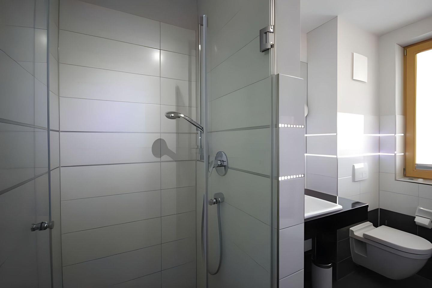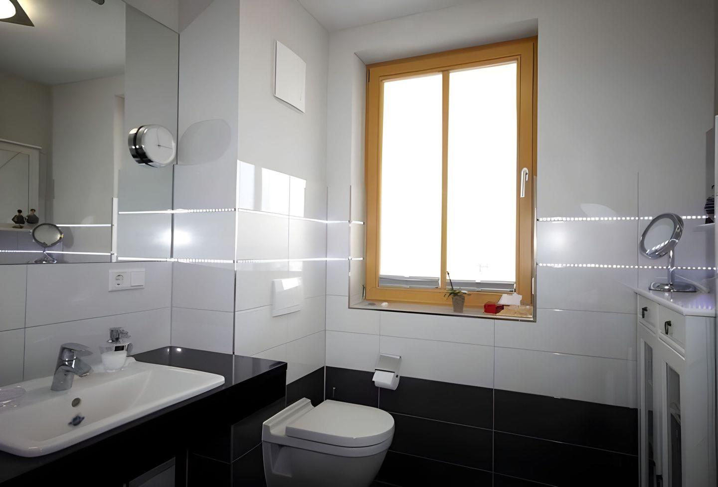 Das großzügige moderne BADEZIMMER mit Fenster; verfügt über eine bodengleiche Dusche, Föhn, einen beleuchteten Kosmetikspiegel und einen Badhocker. Die besonders gestalteten Fliesenwände mit LED-Licht machen aus dem Bad eine Wohlfühloase. Da alle Räume mit einer Fußbodenheizung ausgestattet sind, fühlt man sich auch in der kalten Jahreszeit in der Unterkunft geborgen.