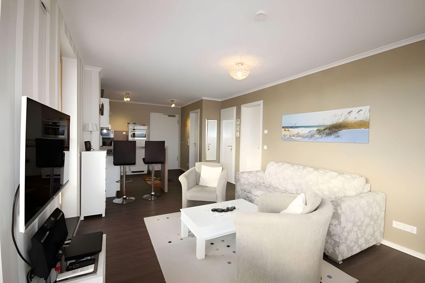 Es erwartet Sie eine liebevoll und komfortabel eingerichtete Ferienwohnung mit Meerblick Ein Lift ist vorhanden. Ein besonderes Highlight sind die ZWEI DACHTERRASSEN (50 qm Westausrichtung und 20 qm Ostausrichtung), die mit hochwertigen Terrassenmöbeln ausgestattet sind und beim Sonnenaufgang mit herrlichem Blick aufs Meer zum ausgiebigen Frühstück einladen. Bequem im Liegestuhl, im Schaukelstuhl oder im XXL-STRANDKORB können Sie bei einem traumhaften Sonnenuntergang die Seele baumeln lassen. Der lichtdurchflutete WOHNRAUM mit Flatscreen-TV (117 cm Bildschirmdiagonale), gemütlichem Funktionssofa (ausziehbar 180 x 200 cm), zwei bequemen Fernsehsesseln und einem Esstisch mit bis zu sechs Stühlen, bieten auch Platz für gemütliche Spielabende.