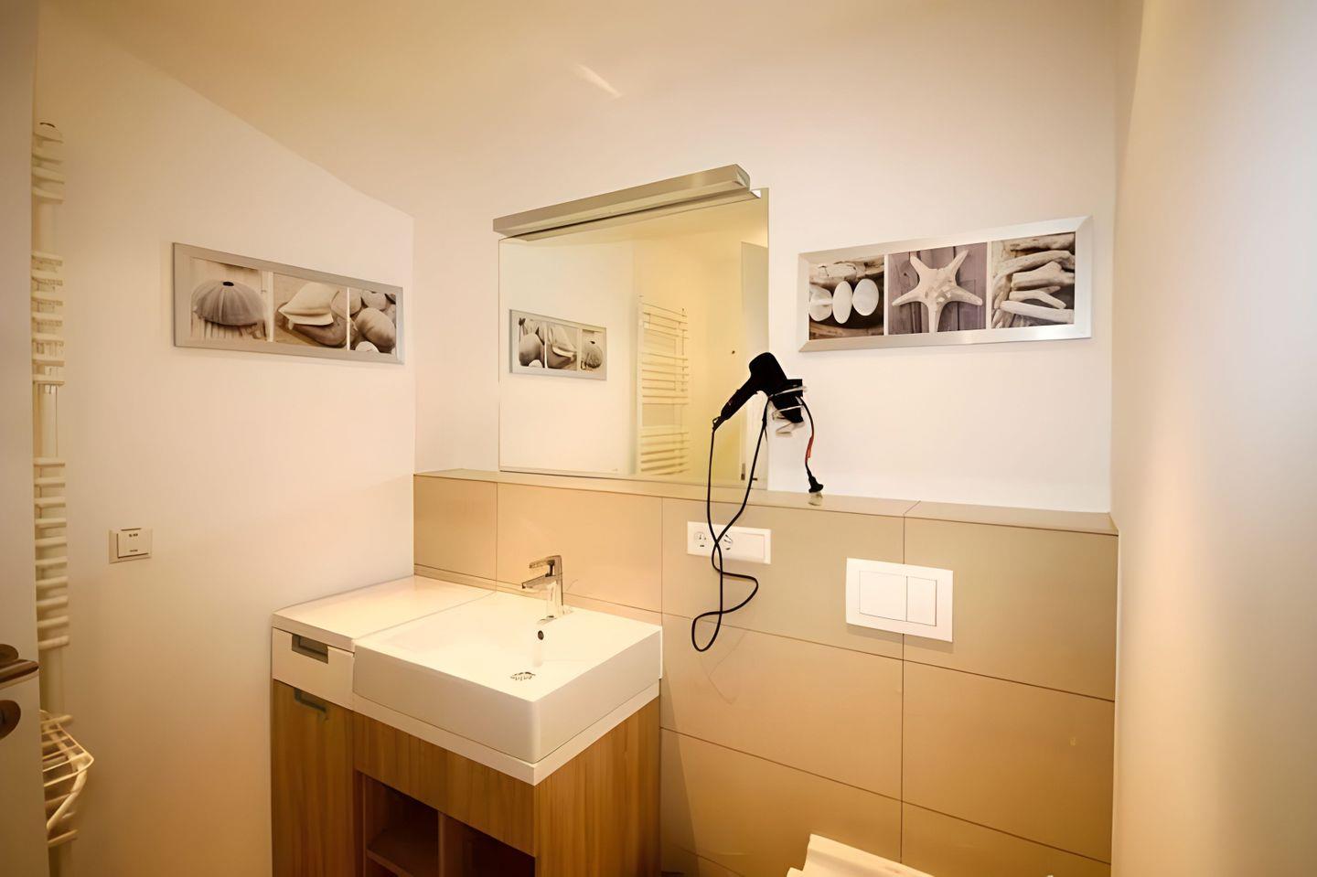 In der EINBAUKÜCHE finden Sie Geschirrspüler, Kaffeemaschine, Wasserkocher, Toaster und Kühlschrank, inklusive Gefrierfach. Das SCHLAFZIMMER verfügt über ein Boxspringbett, ein TV-Gerät und natürlich einen Kleiderschrank. Auf dem BALKON, der nach Westen ausgerichtet ist, können Sie gemeinsame Mahlzeiten genießen oder vom Strandkorb aus, den Blick auf das Meer genießen. Der Zugang erfolgt direkt über den Wohnraum oder das Schlafzimmer. Das moderne BAD ist mit einer bodengleichen Dusche und einem Waschtisch mit großem Spiegel ausgestattet.