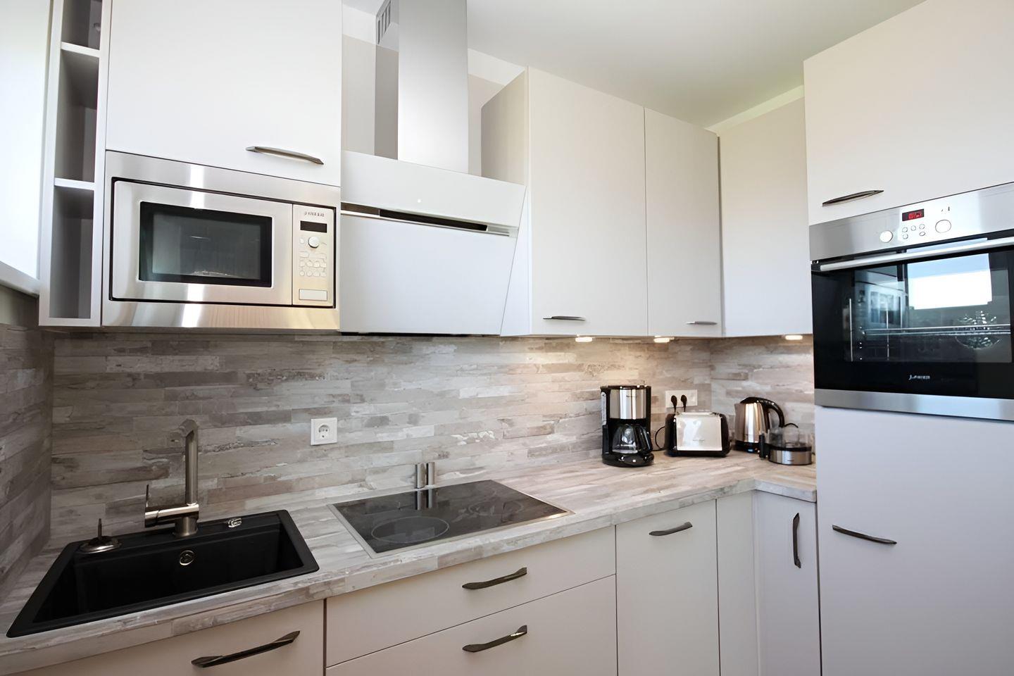 Kaffeemaschine, Wasserkocher, Mikrowelle und Herd mit Cerankochfeld und Backofen