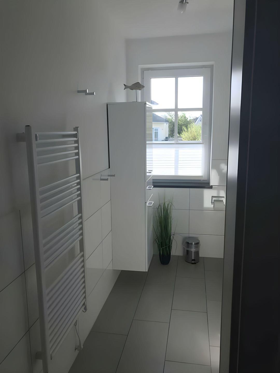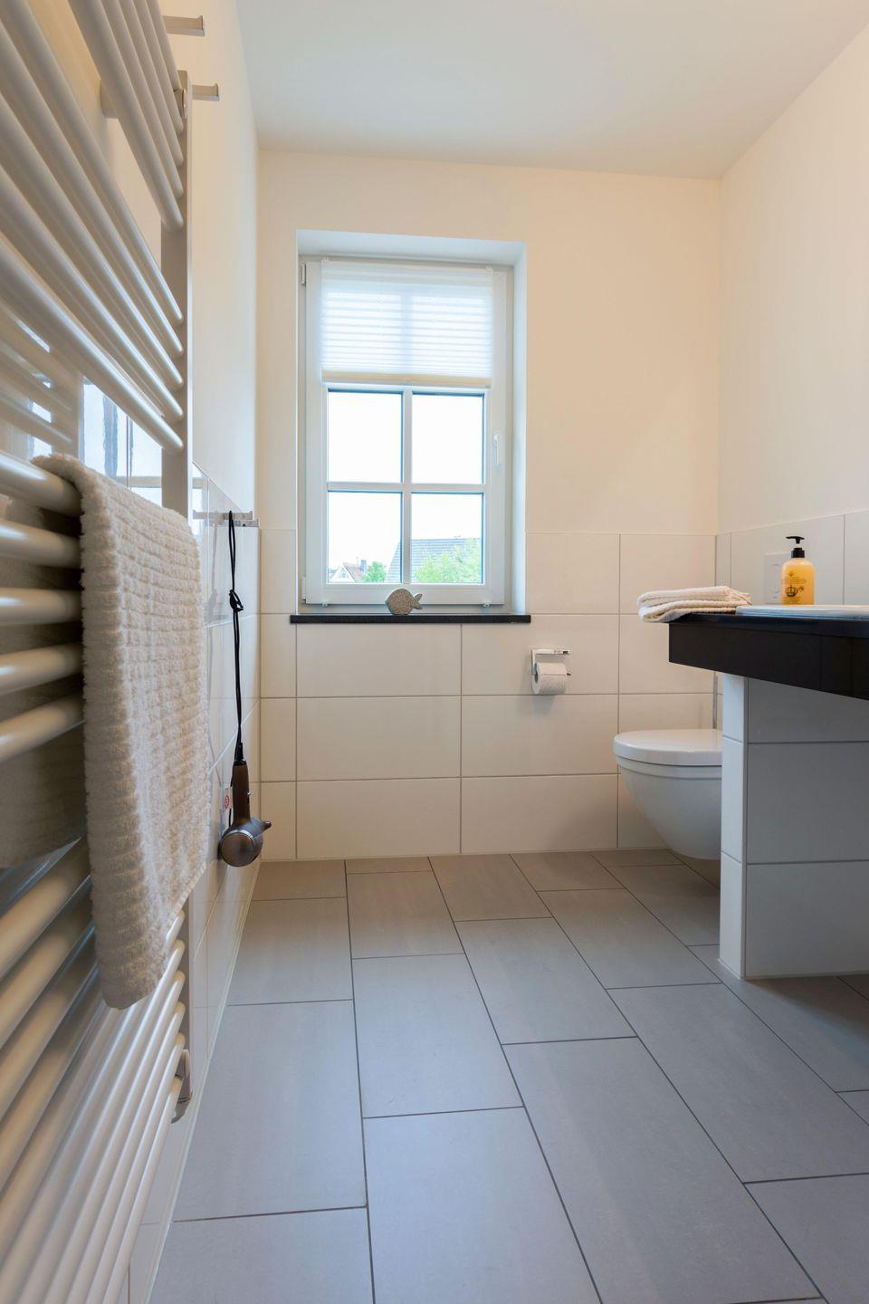 Das helle Badezimmer mit Fenster und bodengleicher Dusche verfügt über einen