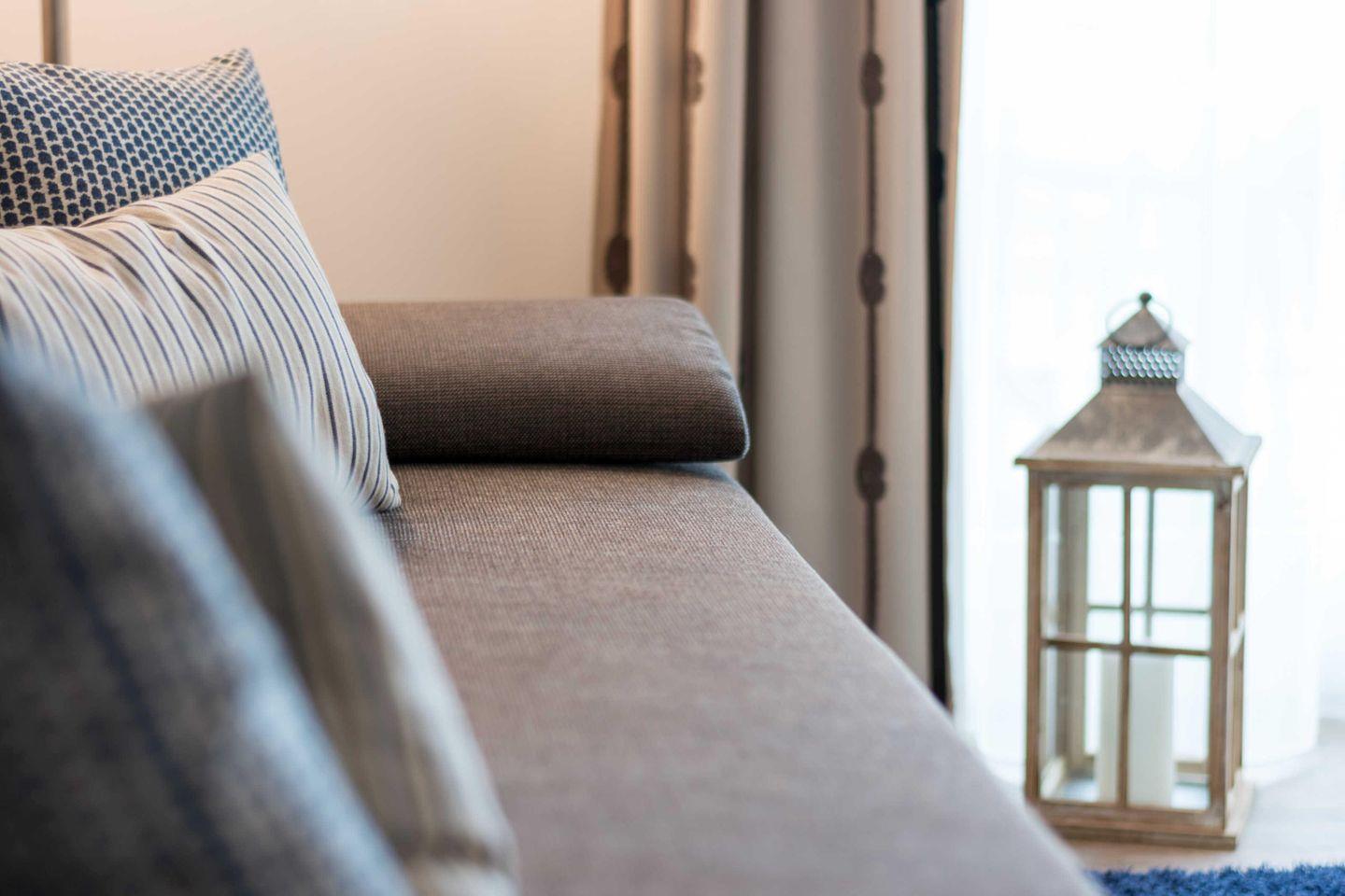 Platz bietet, zum Verweilen ein. Die Couch ist ausziehbar und kann so als