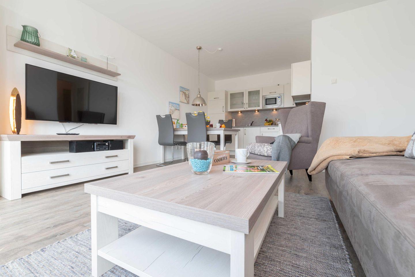 Die Wohnung verfügt über einen Wohn-/Essbereich mit integrierter Küchenzeile