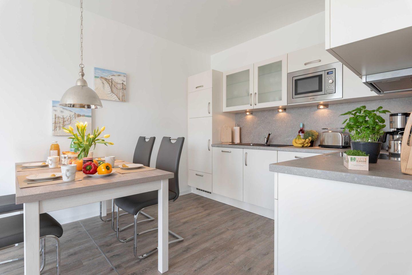 Dunstabzugshaube. Der große Esstisch lädt zu gemeinsamen Mahlzeiten und
