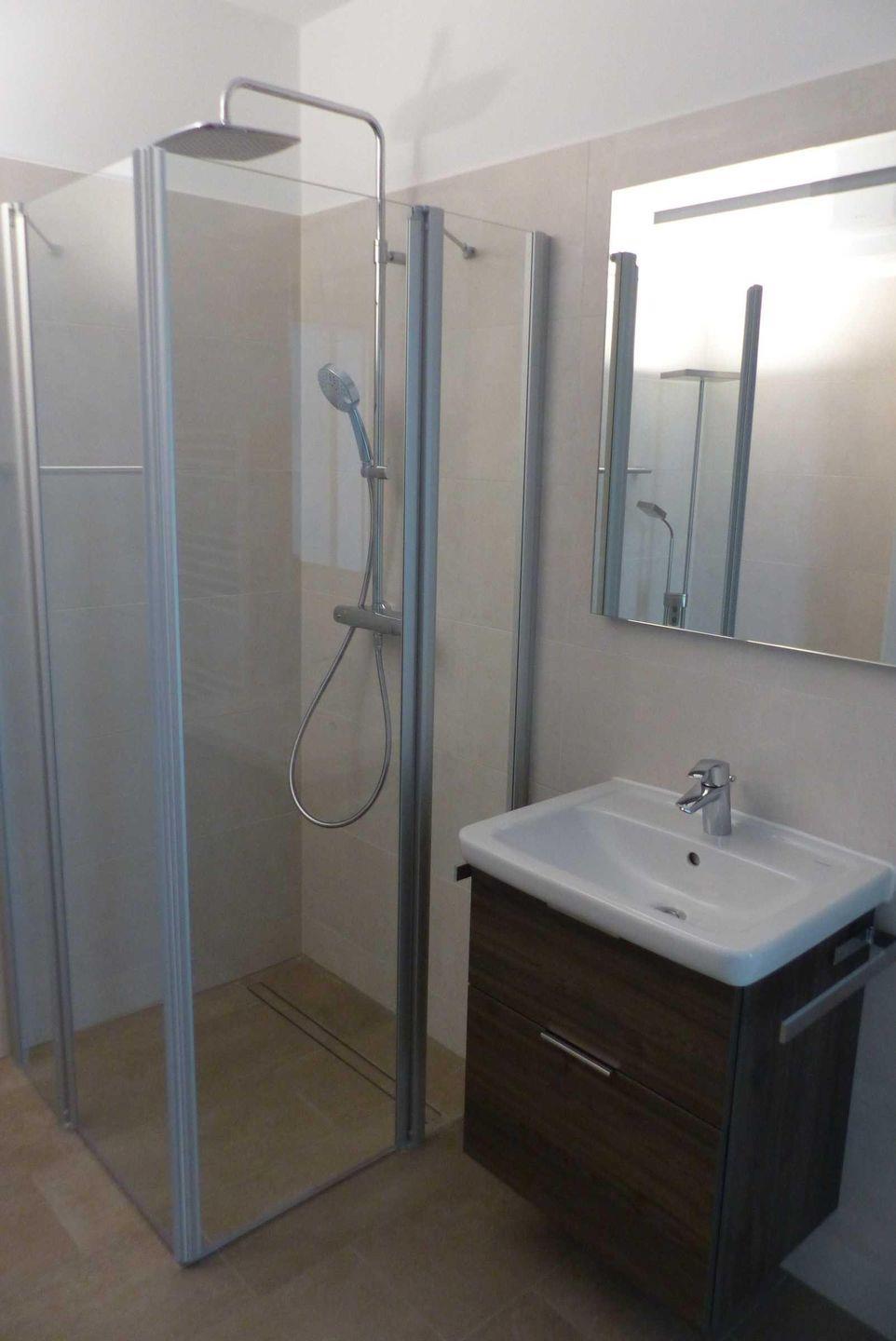Das Badezimmer ist mit einer bodengleichen Dusche, einem Fön und einer