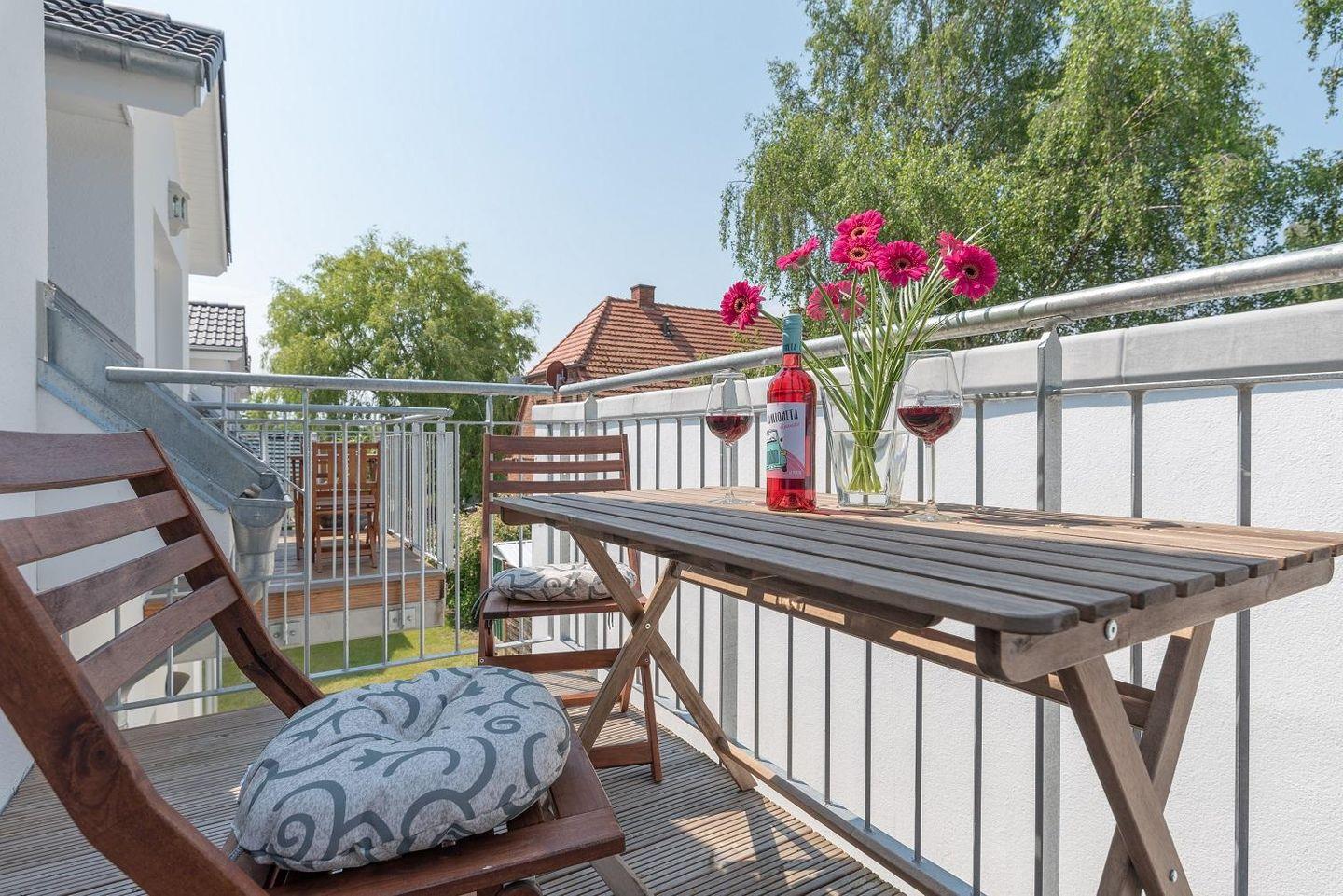 Der Balkon ist mit Tisch und Stühlen samt Sitzauflagen ausgestattet. Außerdem