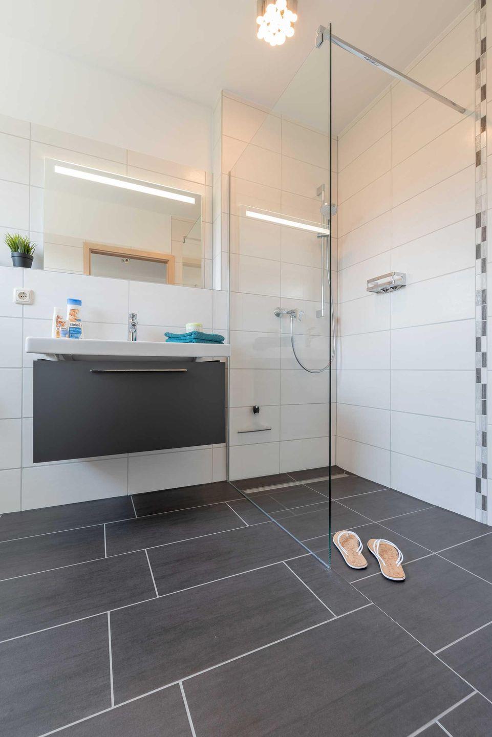 Das moderne Badezimmer mit großem Fenster ist elegant gefliest mit ebenerdiger