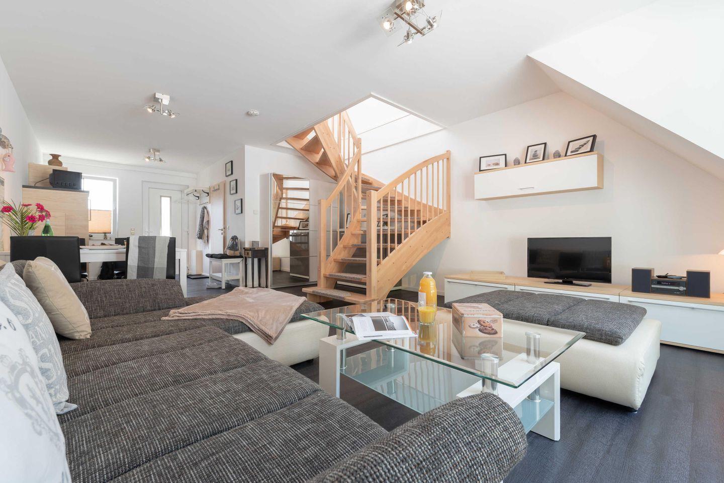 Über eine Treppe im Wohnbereich gelangt man in den Schlafbereich. Hier empfängen