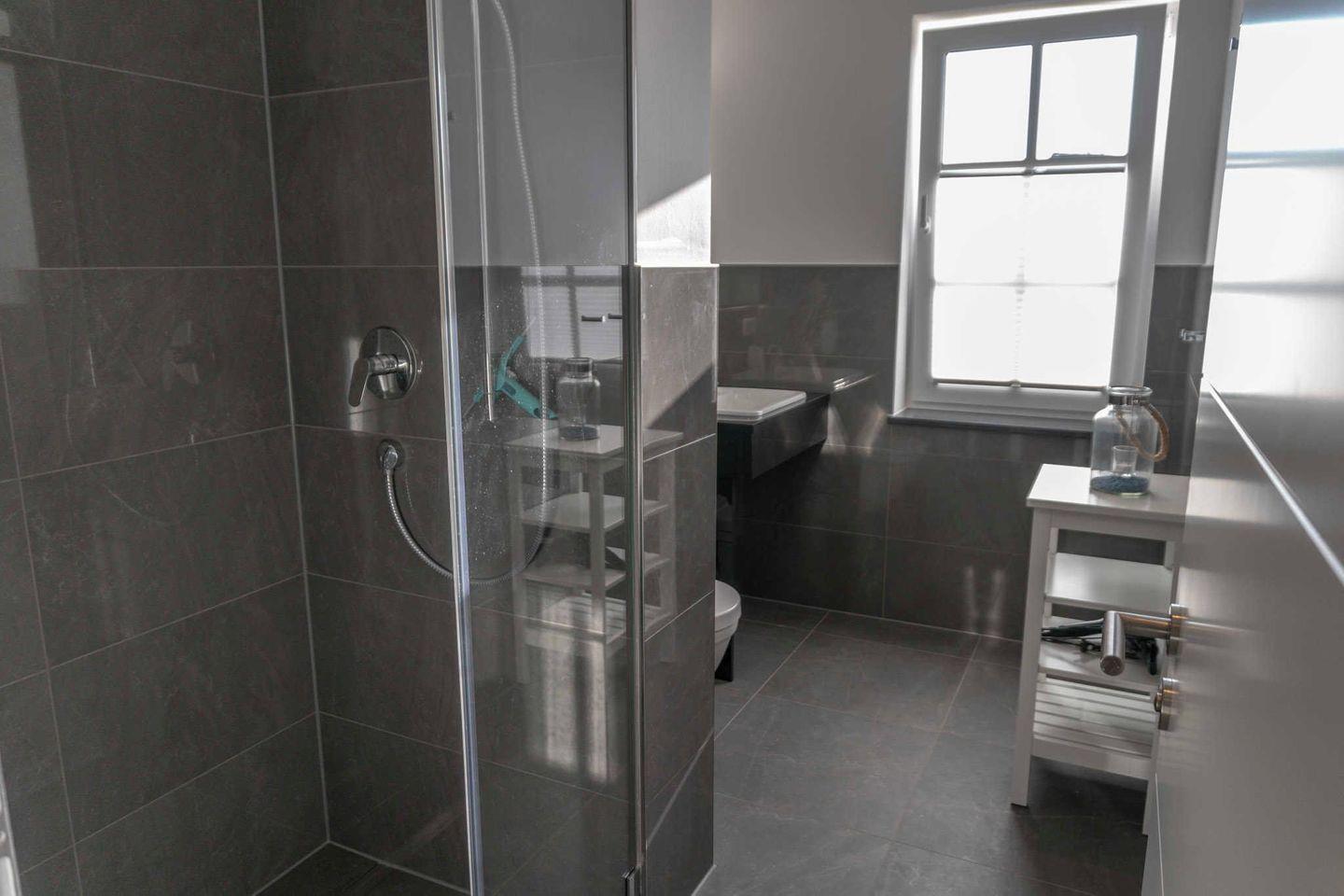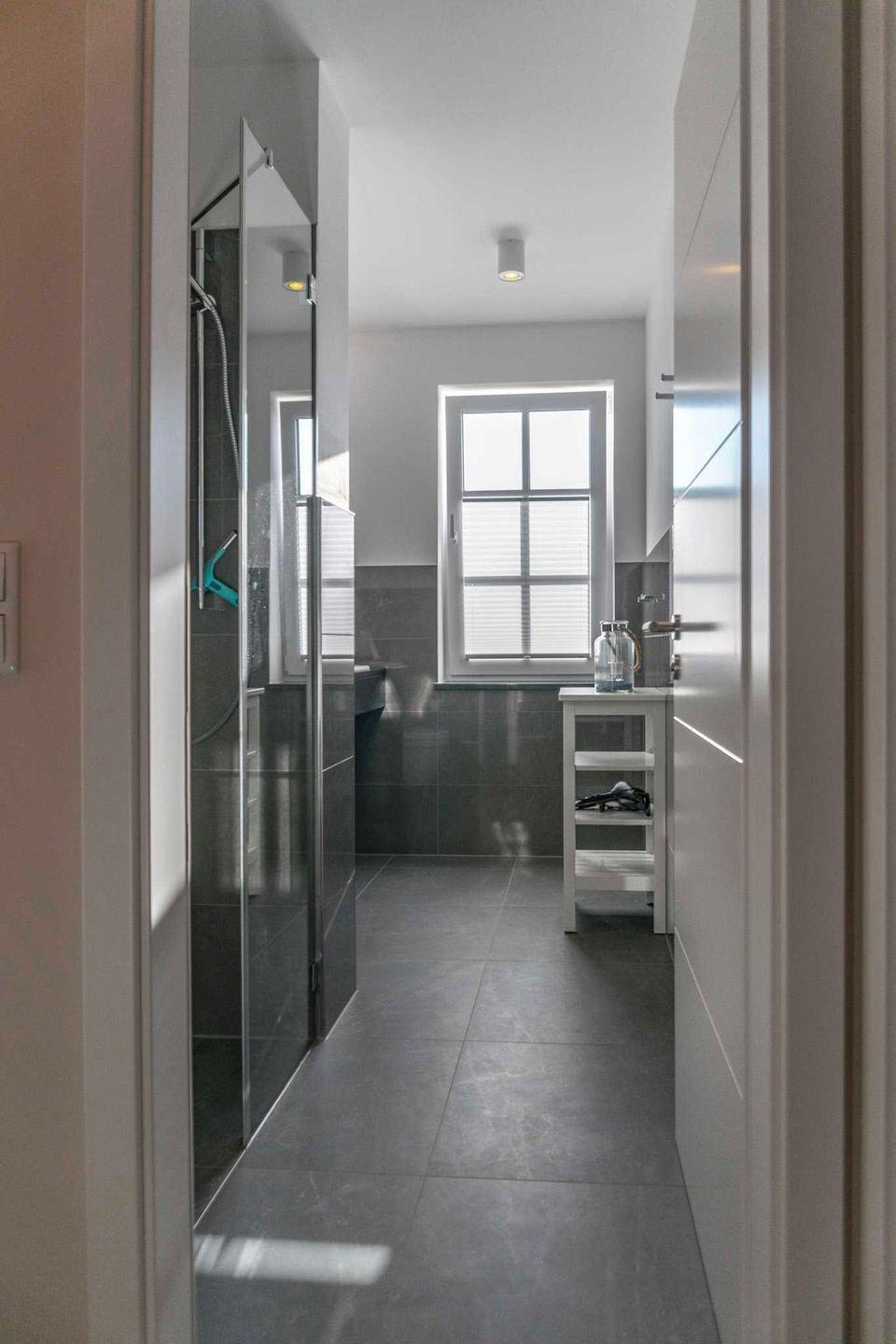 Badezimmer ist wunderschön gestaltet mit einer bodengleichen Dusche, einem