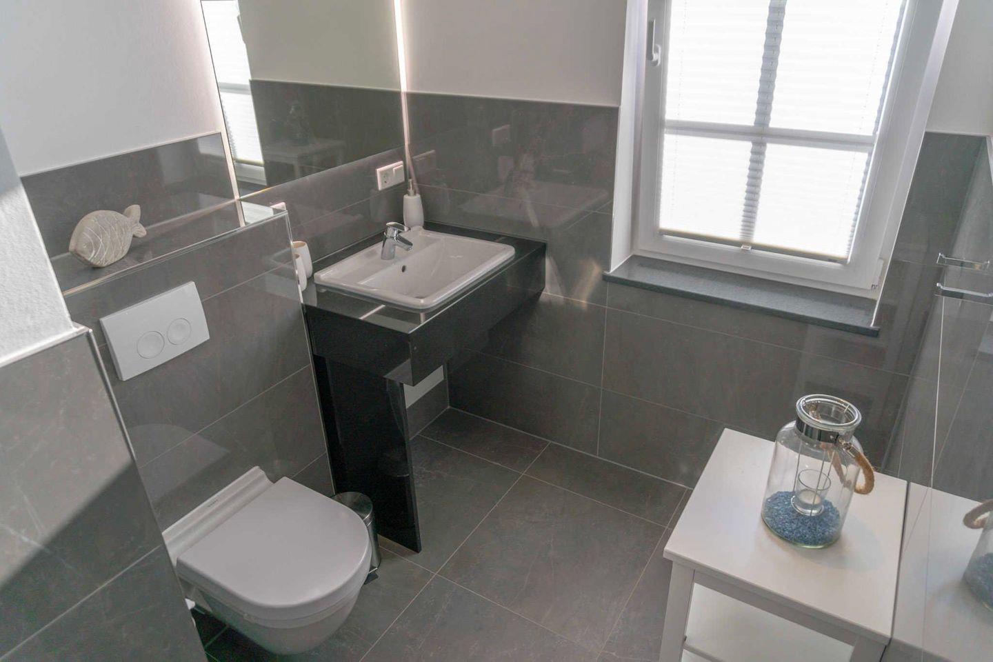 großen Waschtisch und hochwertigen Fliesen. Der Balkon mit Süd-West-Lage mit