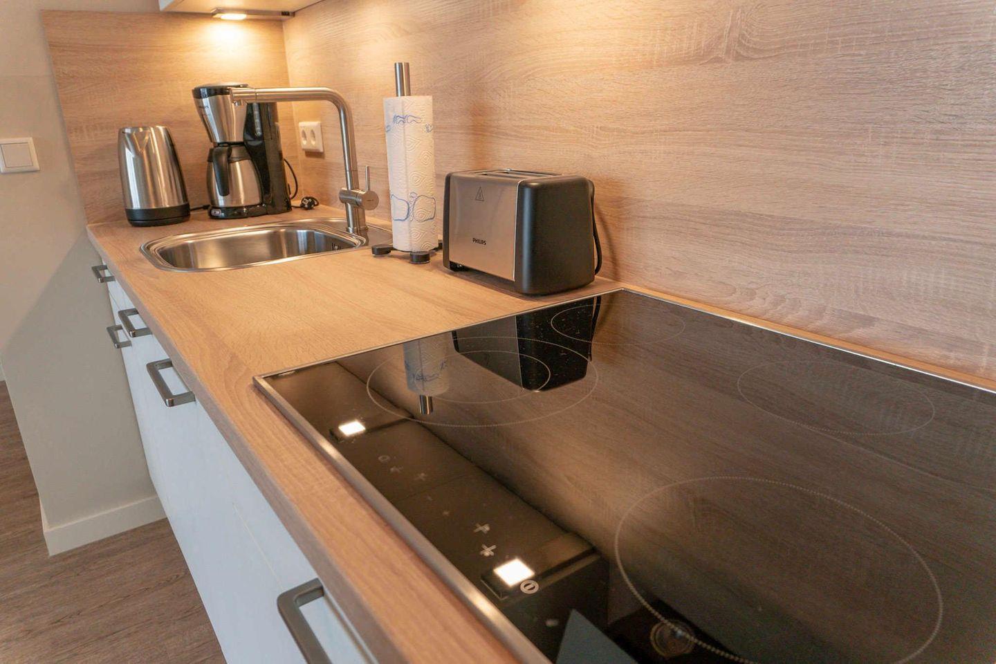 4-Platten-Glaskeramik-Kochfeld und einen Kühlschrank inklusive Gefrierfach. Das