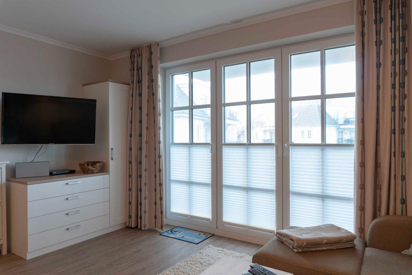 Kleiderschrank ausgestattet. Beide Schlafzimmer sind mit Verdunklungsplissees